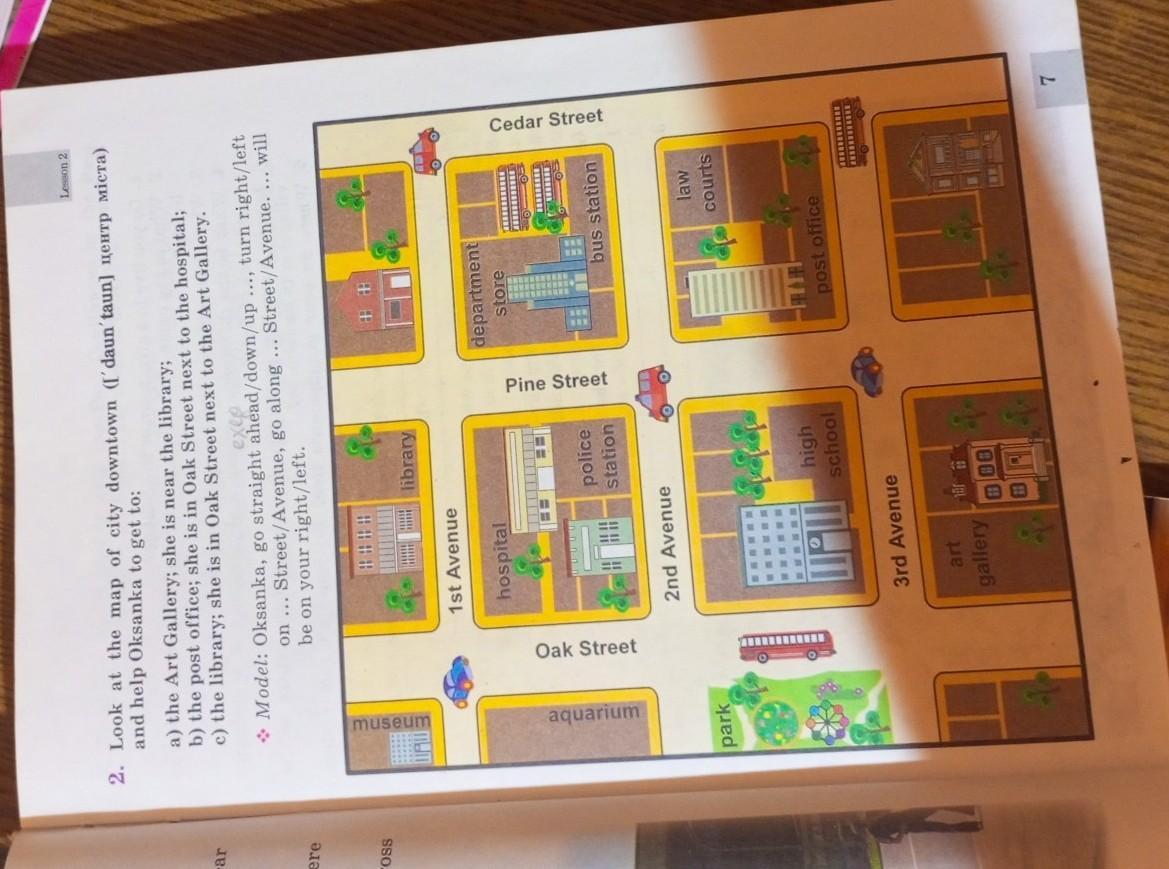 На изображении изображена карта центра города, и вопрос состоит в том, чтобы помочь Оканке добраться до Картинной галереи. Оканка начинается возле библиотеки, а Картинная галерея находится на Дубовой улице.