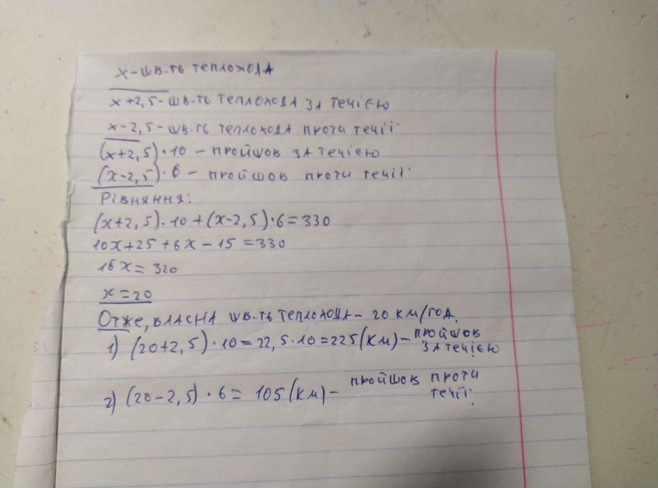 За течією річки теплохід ішов 10 год, а проти течії - 6 год, загалом подолавши 330 км. Скільки кілометрів пройшов теплохід за течією і скільки проти течії, якщо швидкість течії 2,5 км/год?