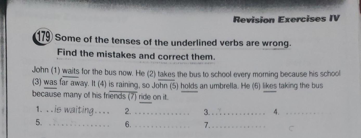 179 Some of the tenses of the underlined verbs are wrong. Find the mistakes and correct them. Revision Exercises IV John (1) waits for the bus now. He (2) takes the bus to school every morning because his school (3) was far away. It (4) is raining, so John (5) holds an umbrella. He (6) likes taking the bus because many of his friends (7) ride on it. 1. ..is waiting..... 2. 5. 6. 3.... 7.. 4. C nt