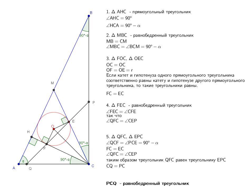 В прямоугольном треугольнике ABC с прямым углом C произведены высота CH и медиана CM. Круг, вписанный в треугольник MCH, касается сторон CM и CH в точках E и F. Прямая EF пересекает катеты треугольника ABC в точках P и Q. Докажите, что треугольник PCQ — равнобедренный.