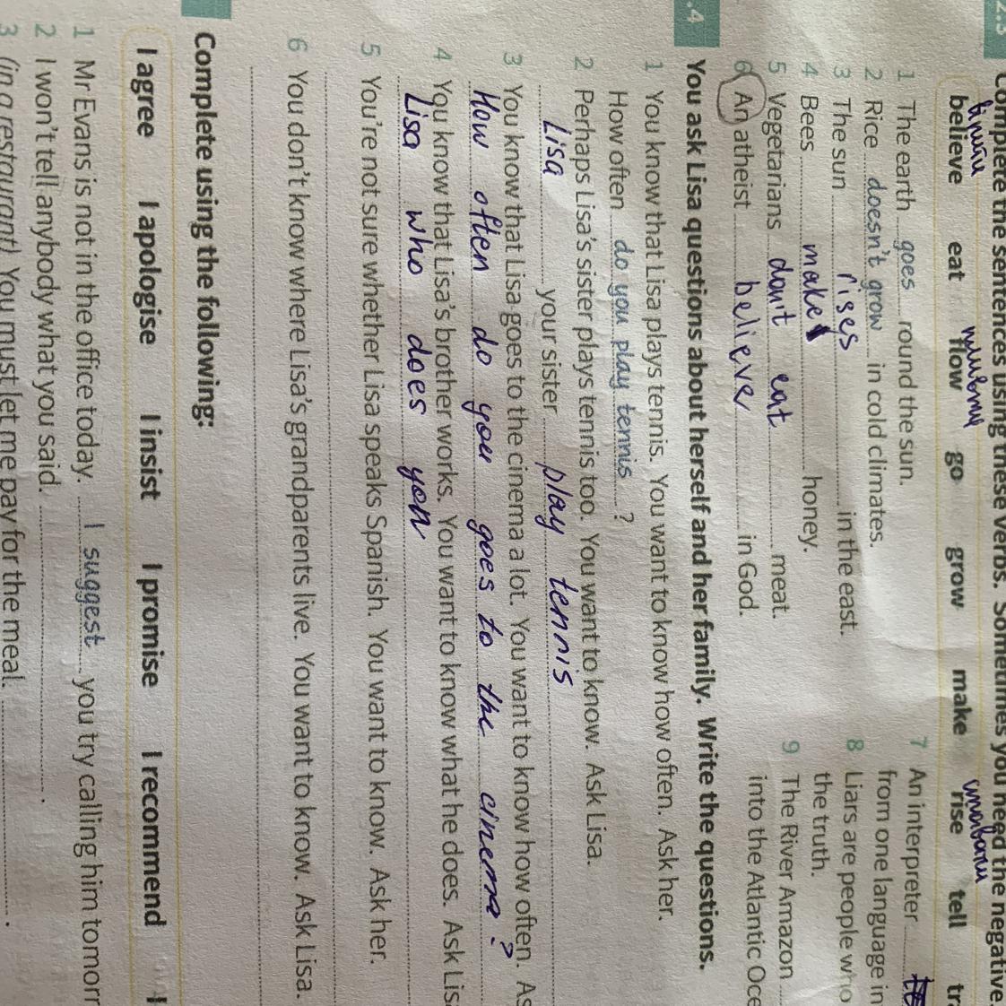 2. Does your sister play tennis? 3. How often do you go to the cinema? 4. What does your brother do? 5. Do you speak Spanish? 6. Where do your grandparents live?