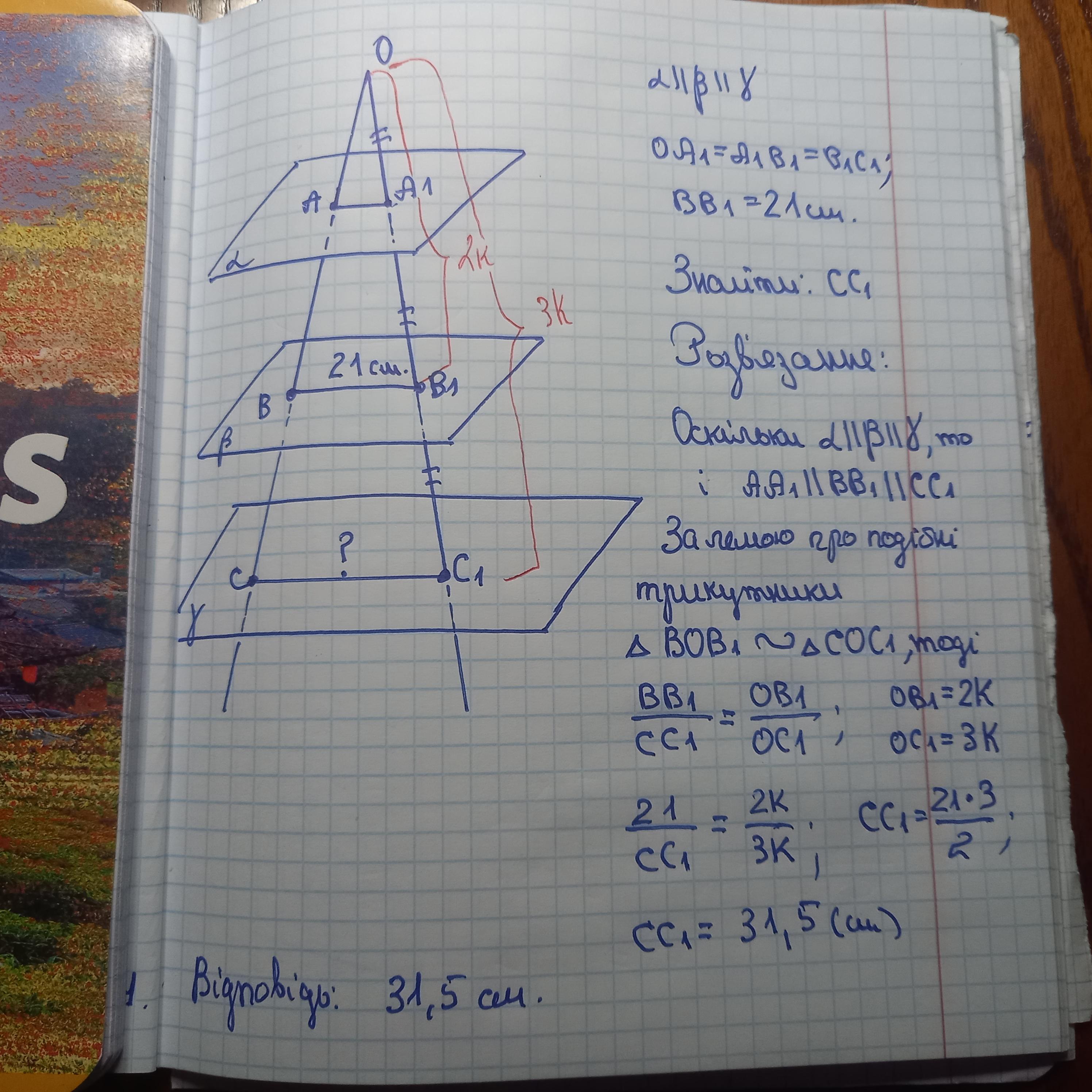 Сторони кута О перетинають паралельні площини а, b і у відповідно в точках A і A1, B i B1, C i C1; OA1 = A1B1 = B1C1; BB1= 21 см.