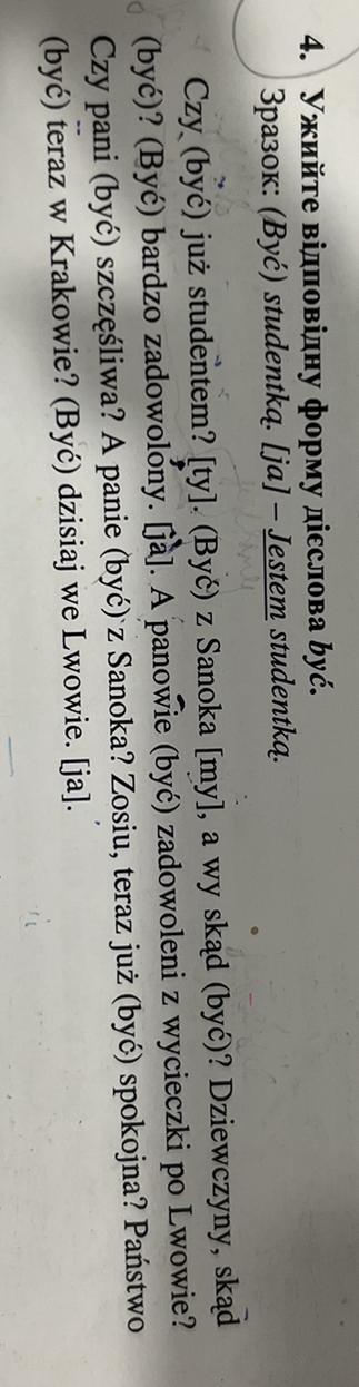 Czy (jesteś) już studentem? [ty]. (Jesteśmy) z Sanoka [my], a wy skąd (jesteście)? Dziewczyny, skąd (jesteście)? (Jestem) bardzo zadowolony. [ja]. A panowie (są) zadowoleni z wycieczki po Lwowie? Czy pani (jest) szczęśliwa? A panie (są) z Sanoka? Zosiu, teraz już (jesteś) spokojna? Państwo (są) teraz w Krakowie? (Jestem) dzisiaj we Lwowie. [ja].