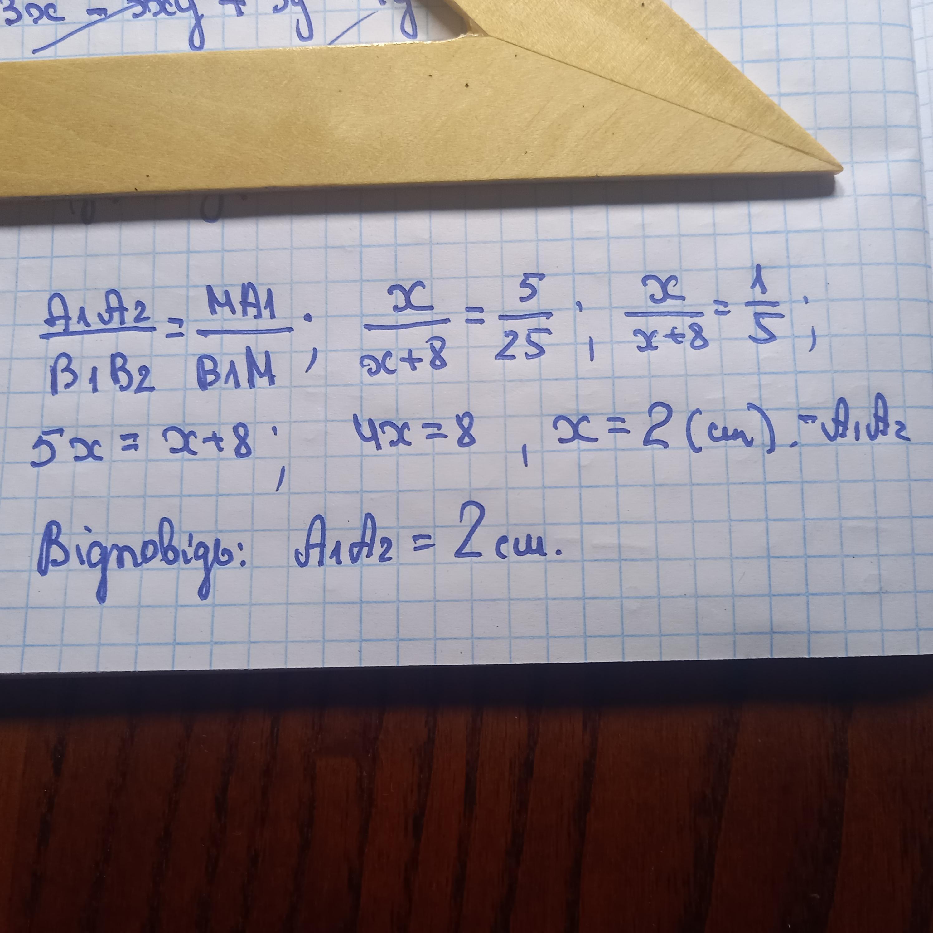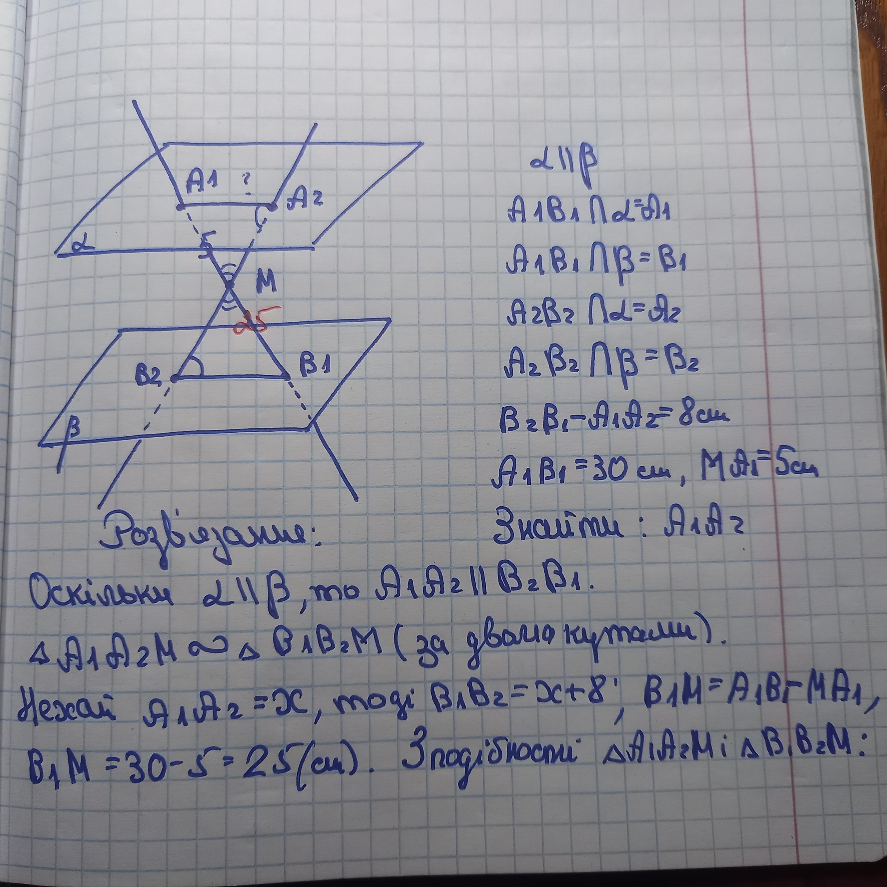 ними, проведено прямі. Одна з прямих перетинає а і b в точках А1 і В1, а друга - у точках А2 і В2 відповідно. Знайдіть довжину відрізка А1А2 якщо вона на 8 см менша від довжини відрізка B1B2 А1В1 =30 см, МА1= 5 см.