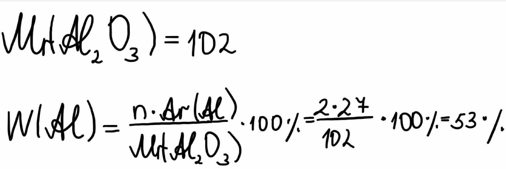 2) ω(Al) = N(Al) * Ar(Al) * 100% / Mr(Al2O3) = 2 * 27 * 100% / 102 = 52,94%.