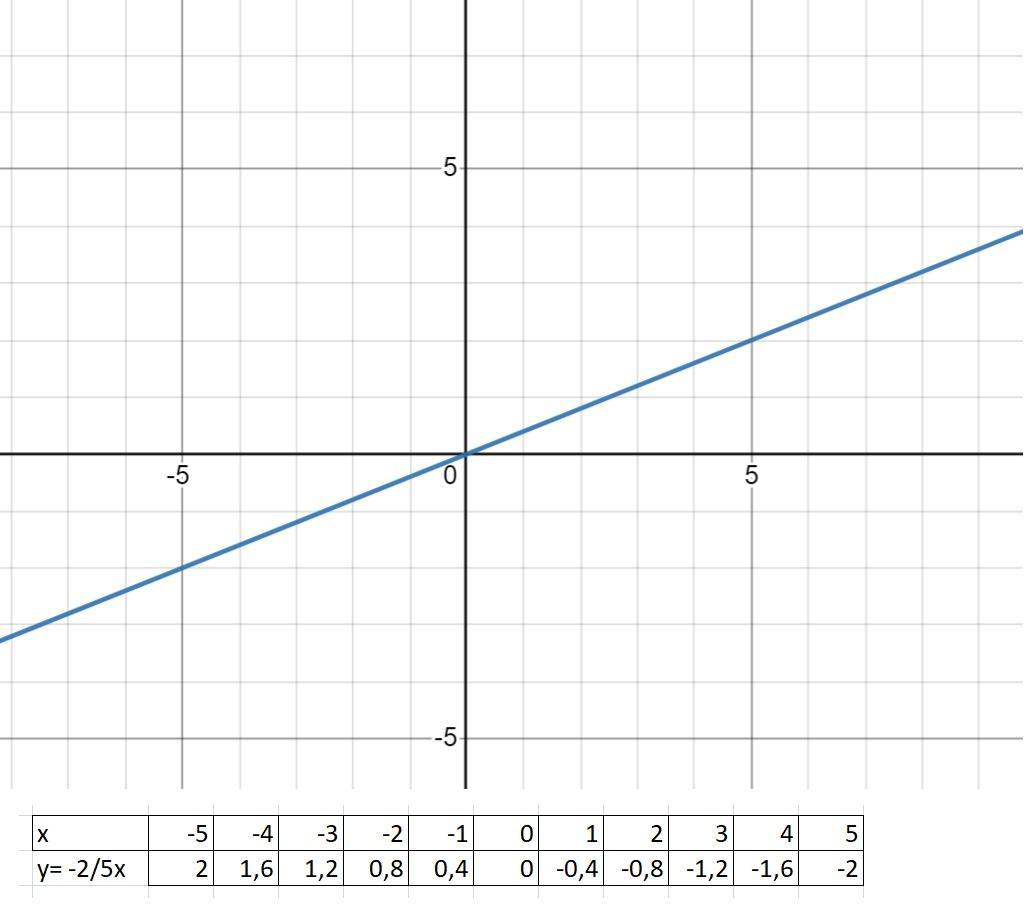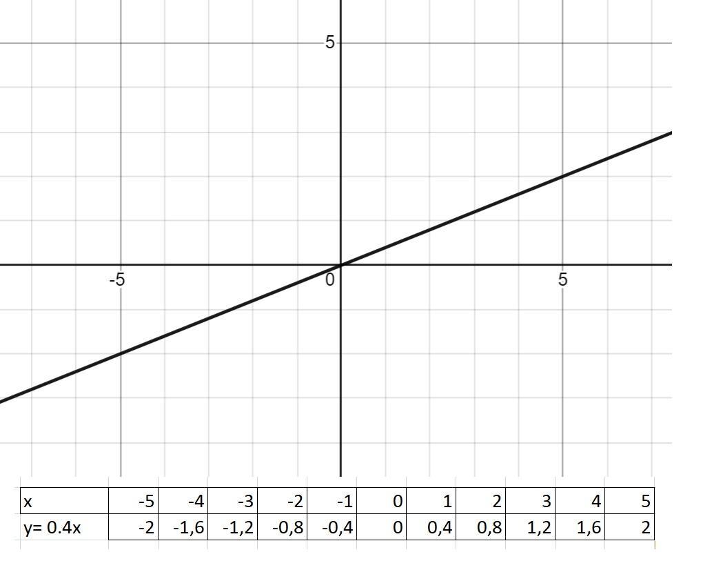 4) График функции y = 0.4x будет представлять прямую линию, проходящую через начало координат (0,0) и с угловым коэффициентом 0.4. Она будет иметь положительный наклон и будет расположена в первом и третьем квадрантах.