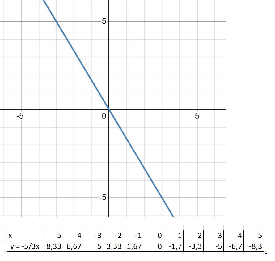 2) График функции y = -5/3x будет представлять прямую линию, проходящую через начало координат (0,0) и с угловым коэффициентом -5/3. Она будет иметь отрицательный наклон и будет расположена во втором и четвертом квадрантах.