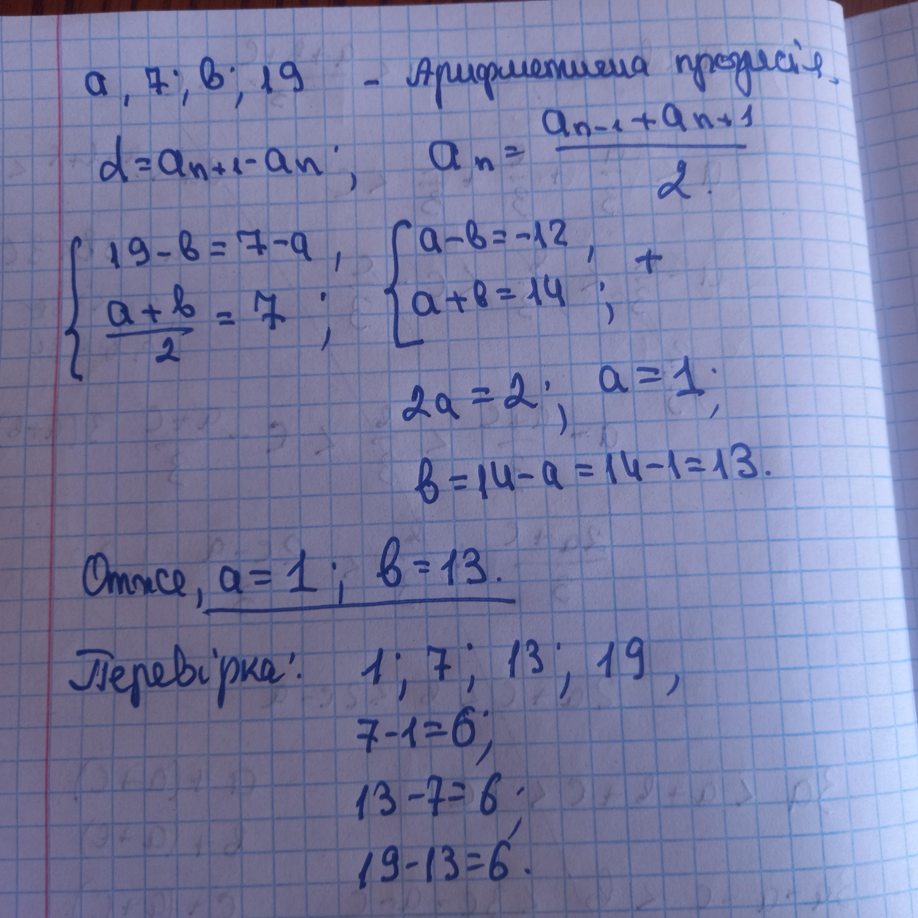 При каких значениях а и в последовательность a; 7; b; 19; ... является арифметической рессией?