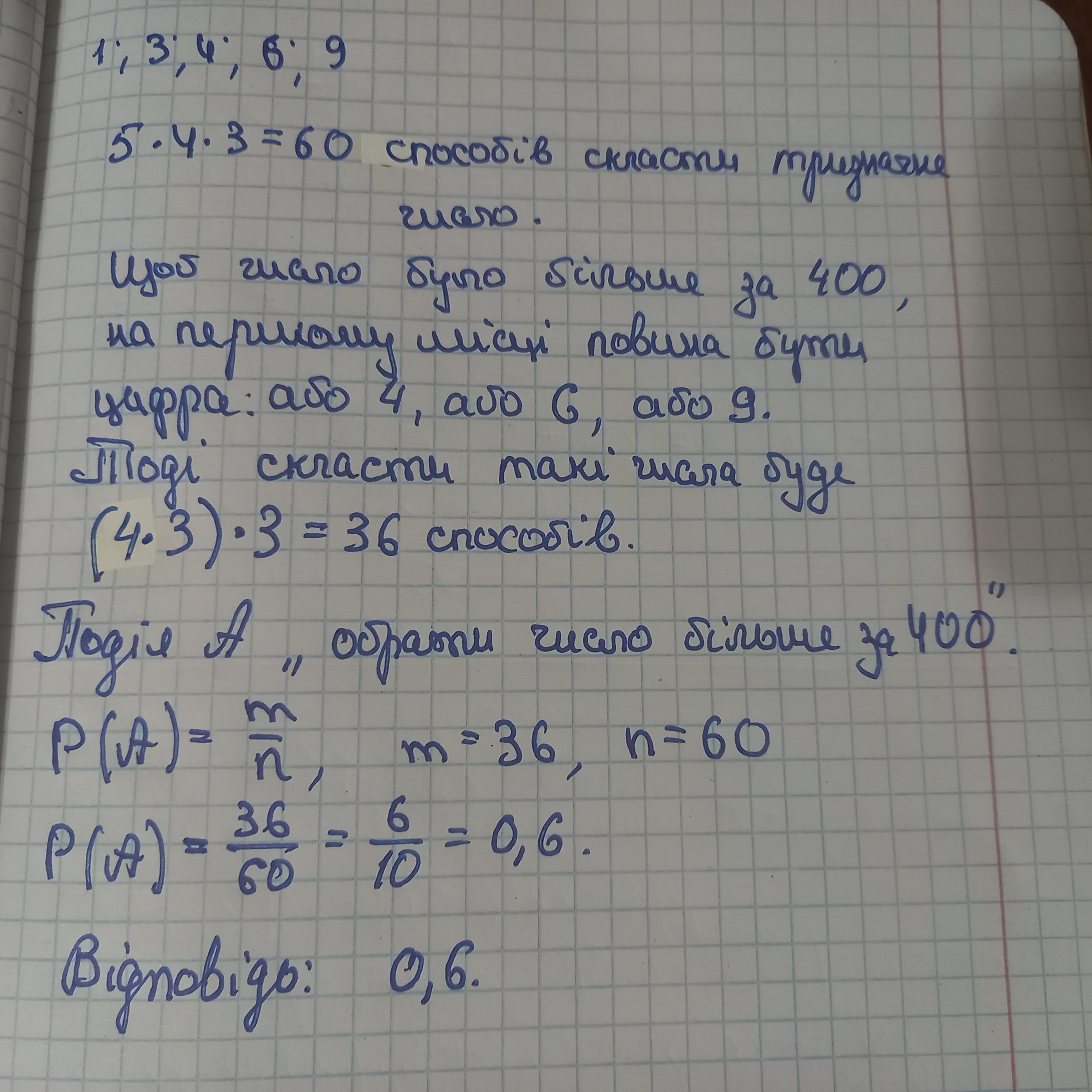 То, что случайно выбранное число будет больше 400, равносильно тому, что его первая цифра - это 4, 6 или 9. Поскольку всего у нас пять цифр, а на первом месте должна быть одна из трех цифр, делаем вывод, что вероятность случайно выбранному числу быть больше 400, равна 3/5.