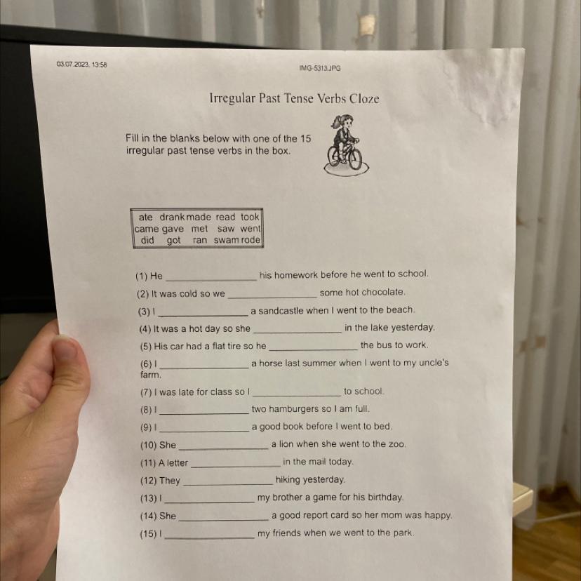 1. He did his homework 2. It was cold so we drank 3. I made 4. It was a hot day so she swam 5. so he took the bus 6. I rode a horse 7. so I ran to school. 8. I ate 9. I read a good book 10. She saw a lion 11. A latter came 13. I gave my brother 14. She got a good report 15. I met my friends 12. They went.