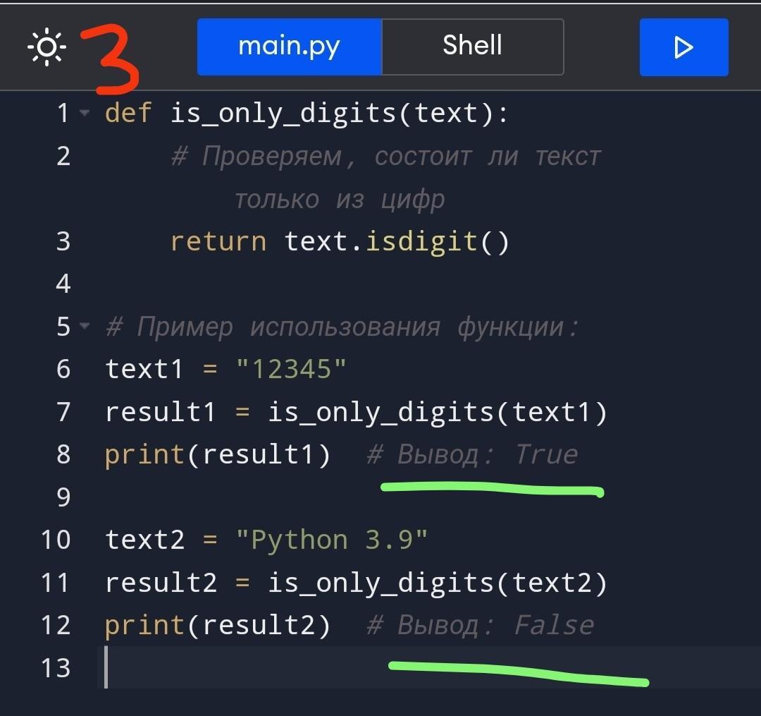 Напишите функцию, которая принимает текст. Функция возвращает True, если текст состоит только из цифр, и False в противном случае.