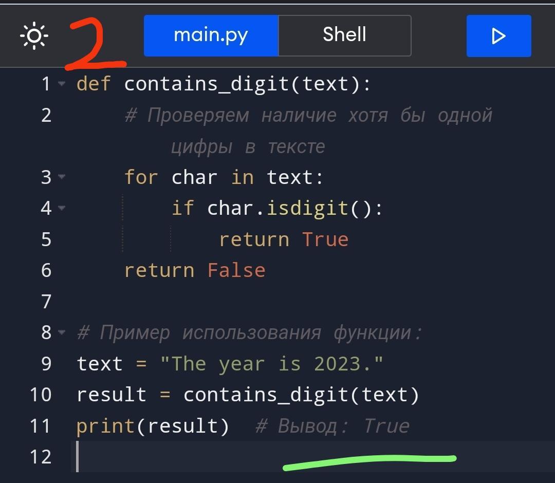 Напишите функцию, которая принимает текст. Функция возвращает True, если в тексте есть хотя бы одна цифра, и False в противном случае.