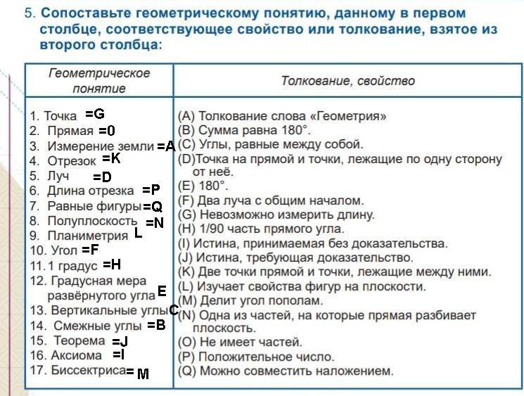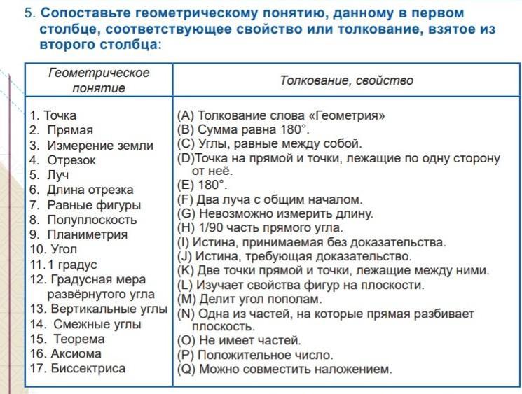 5. Сопоставьте геометрическому понятию, данному в первом столобице, состоит ветствующее свойство или толкование, взятое из второго столбца: Геометрическое понятие