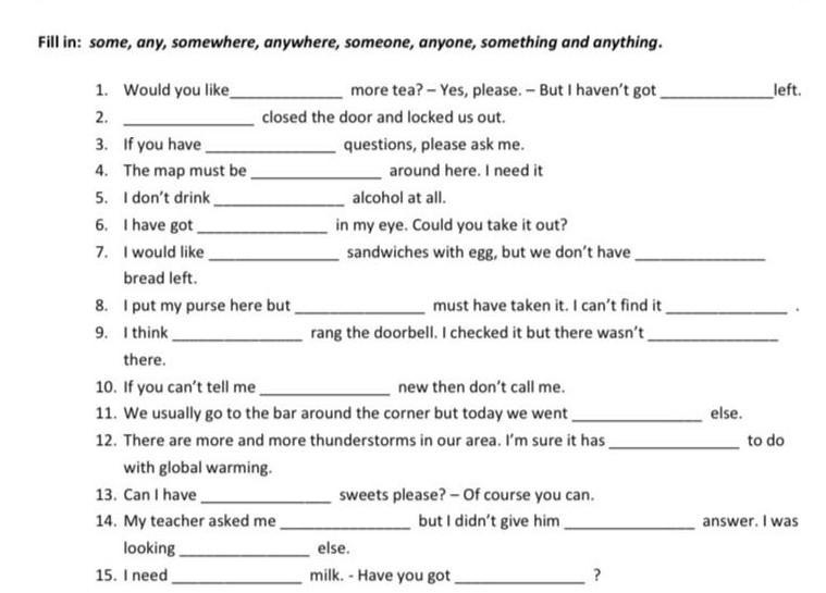 Fill in: some, any, somewhere, anywhere, someone, anyone, something and anything. more tea? - Yes, please. - But I haven't got_ 1. Would you like 2. 3. If you have 4. The map must be 5. I don't drink 6. I have got 7. I would like bread left. I put my purse here but 8. 9. I think closed the door and locked us out. with global warming. 13. Can I have, 14. My teacher asked me. looking 15. I need questions, please ask me. around here. I need it there. 10. If you can't tell me, new then don't call me. 11. We usually go to the bar around the corner but today we went 12. There are more and more thunderstorms in our area. I'm sure it has_ alcohol at all. in my eye. Could you take it out? sandwiches with egg, but we don't have must have taken it. I can't find it. rang the doorbell. I checked it but there wasn't sweets please? - Of course you can. but I didn't give him else. milk. - Have you got ? else. left. to do answer. I was