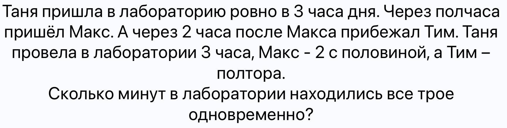 потому что Тим был полтора часа, макс был 2 с половиной ведь он опаздал на 30мин. Если посчитать то 2,5+0,5=3часа, а Таня была в лабораторий ровно 3 часа.