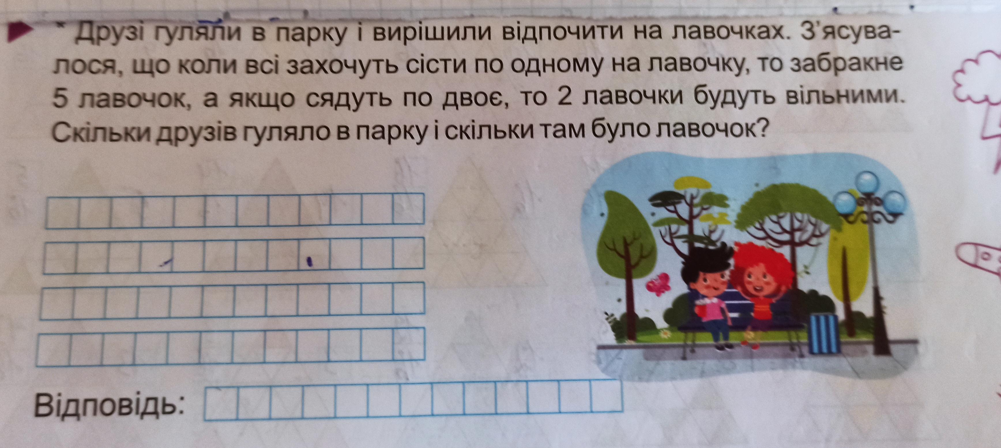 Якщо сядуть на лавочку по двоє, то знадобиться х-2 лавочок. Маємо рівняння: