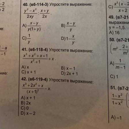 \displaystyle\bf\\40\\\\\frac{y^{2} -x^{2} }{2xy} :\frac{x+y}{2x} =\frac{(y-x)\cdot(y+x)}{2xy}\cdot\frac{2x}{x+y} =\frac{y-x}{y}  =\\\\\\=\frac{y}{y} -\frac{x}{y} =\boxed{1-\frac{x}{y} }\\\\41)\\\\\frac{x^{3} +x^{2} +x+1}{x^{2} +1} +x=\frac{(x^{3}+x)+(x^{2}+1)  }{x^{2} +1} +x=\\\\\\=\frac{x\cdot(x^{2}+1)+(x^{2}+1)  }{x^{2} +1} +x=\frac{(x^{2} +1)\cdot(x+1)}{x^{2} +1}+x=\\\\\\=x+1+x=\boxed{2x+1}\\\\42)\\\\\frac{x^{3} +2x^{2} +x}{(x+1)^{2} } -x=\frac{x\cdot(x^{2} +2x+1)}{(x+1)^{2} } -x=