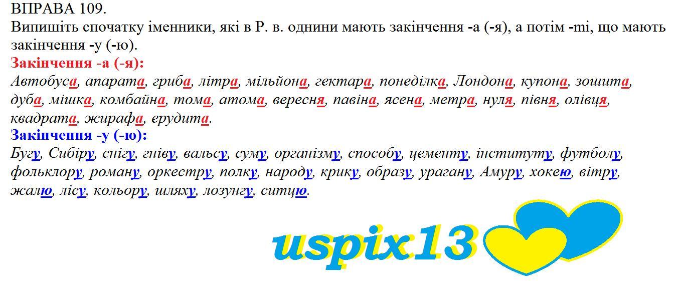 ВПРАВА 109. Випишіть спочатку іменники, які в Р. в. однини мають закінчення -а (-я), а потім - ті, що мають закінчення -у (-ю). im Буг, Сибір, сніг, гнів, автобус, вальс, сум, апарат, організм, гриб, спосіб, літр, мільйон, цемент, інститут, футбол, гектар, фольклор, роман, понеділок, оркестр, полк, народ, Лондон, купон, крик, об- раз, зошит, ураган, Амур, хокей, дуб, вітер, жаль, мішок, комбайн, том, ліс, колір, атом, вересень, дзвiн, шлях, ясен, метр, лозунг, ситець, нуль, півень, олівець, квадрат, жираф, ерудит.