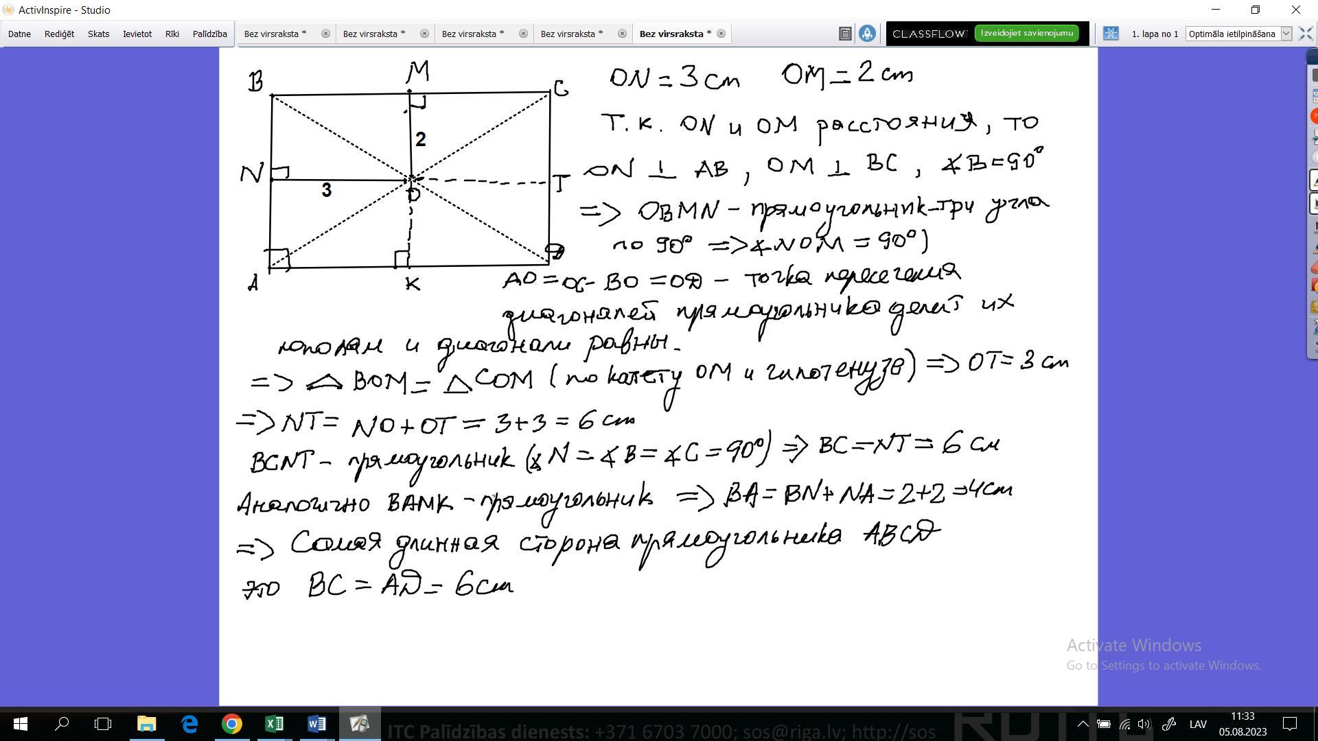 точка пересечения диагоналей прямоугольника отстоит от его сторон на 2см и 3см. Найдите большую сторону данного прямоугольника