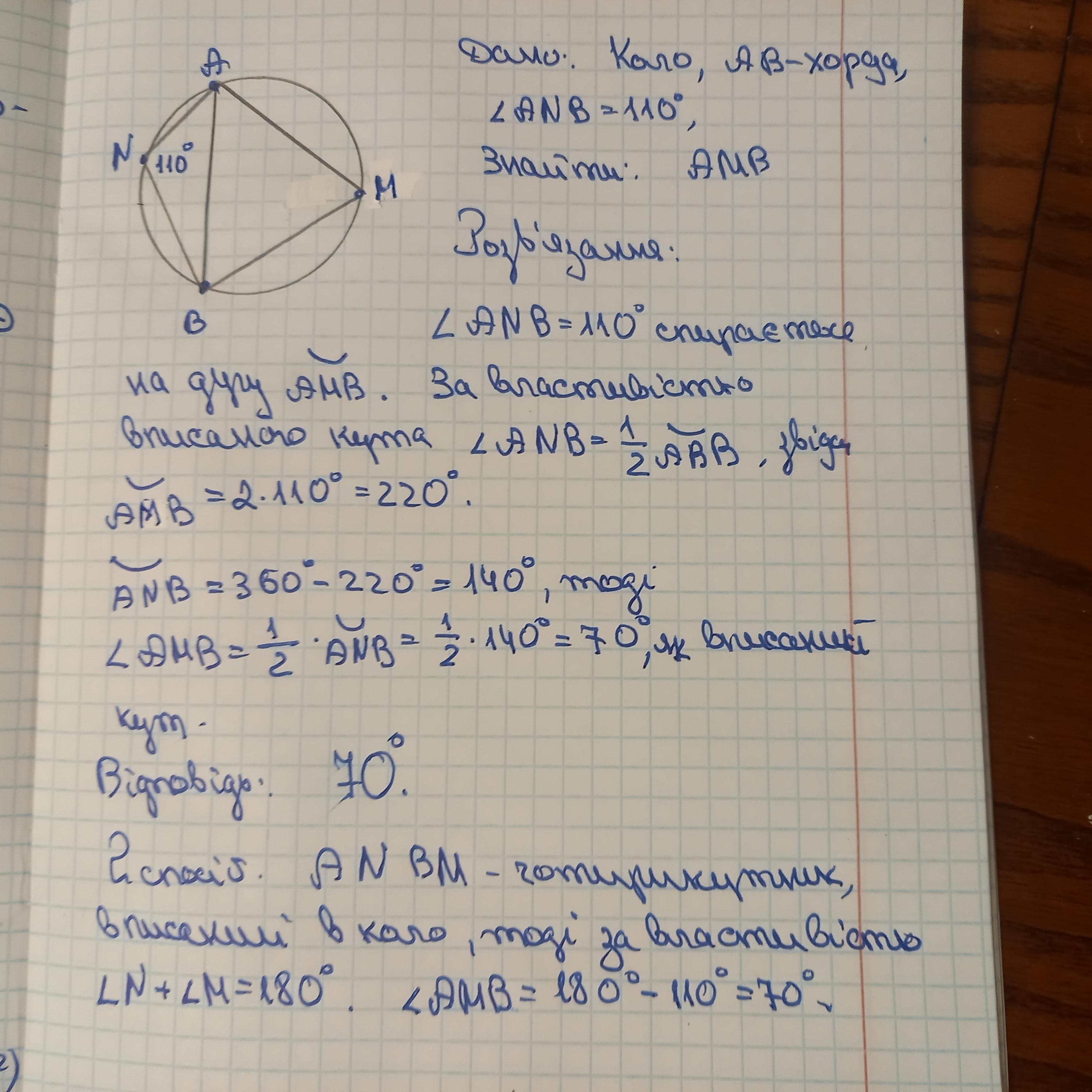 Оскільки ZANB = 110°, тоді кут ZAMB = 180° - ZANB = 180° - 110° = 70°.