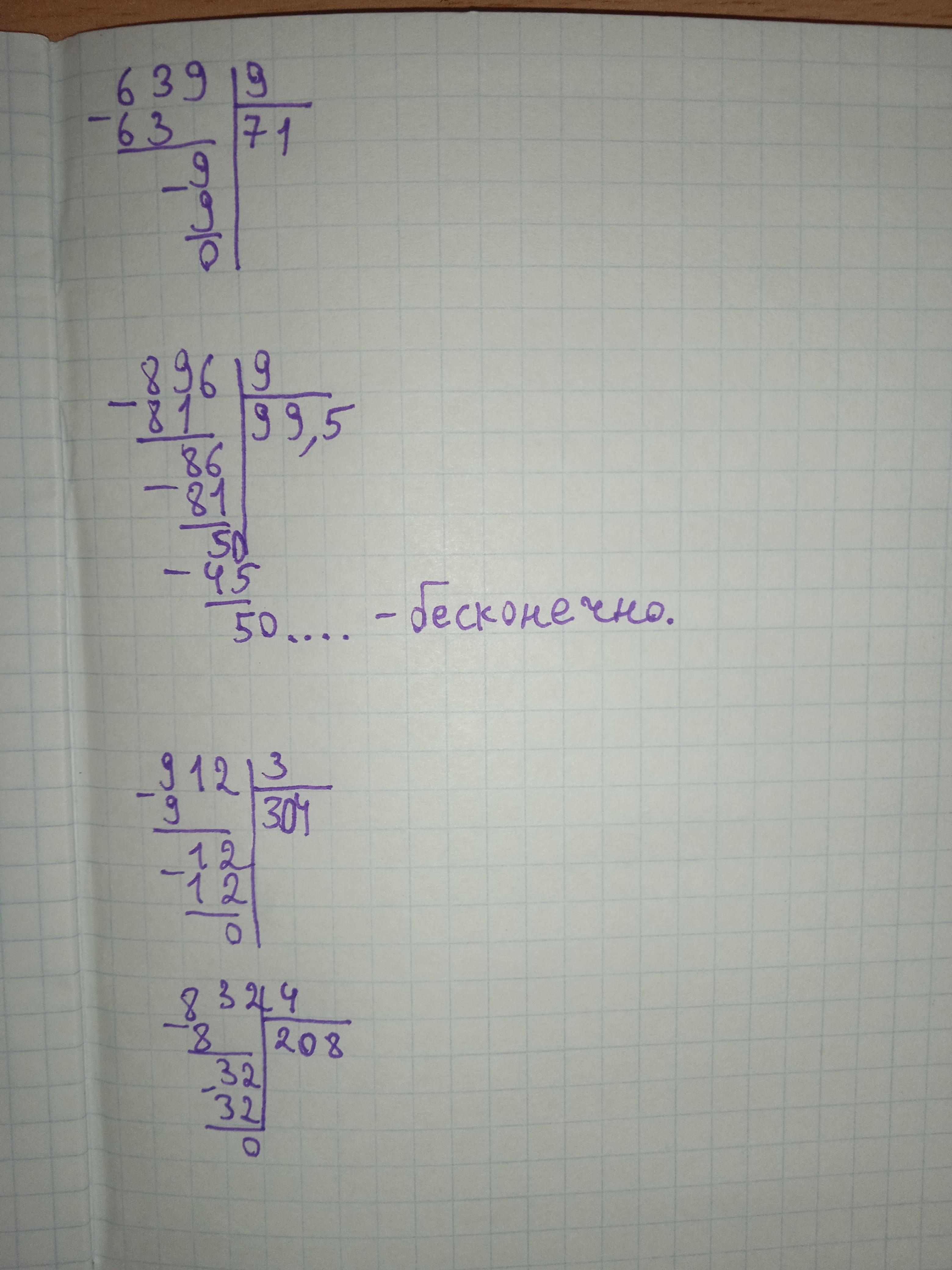 Срочно помогите! 639:9 896:9 912:3 832:4 в столбик, фото если можно