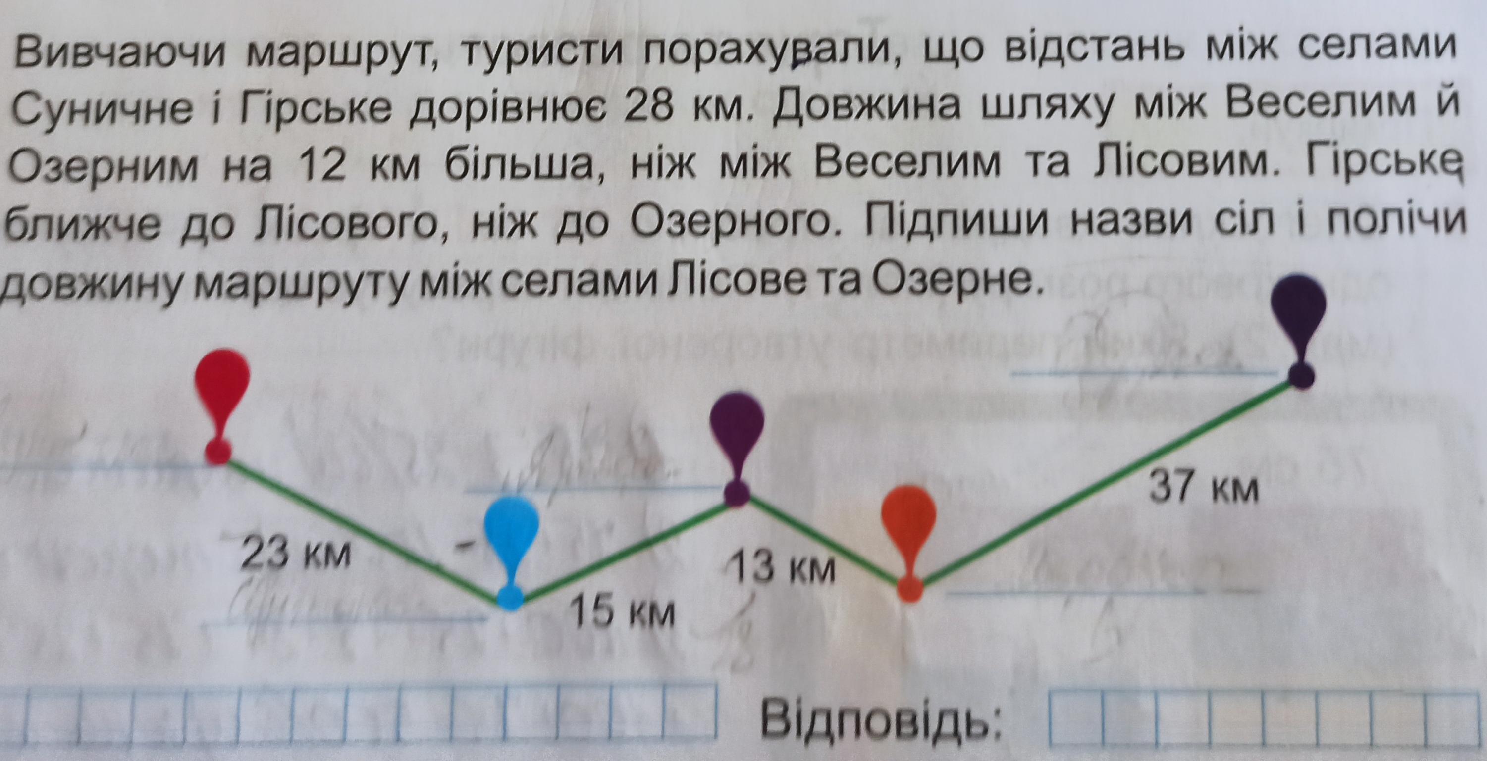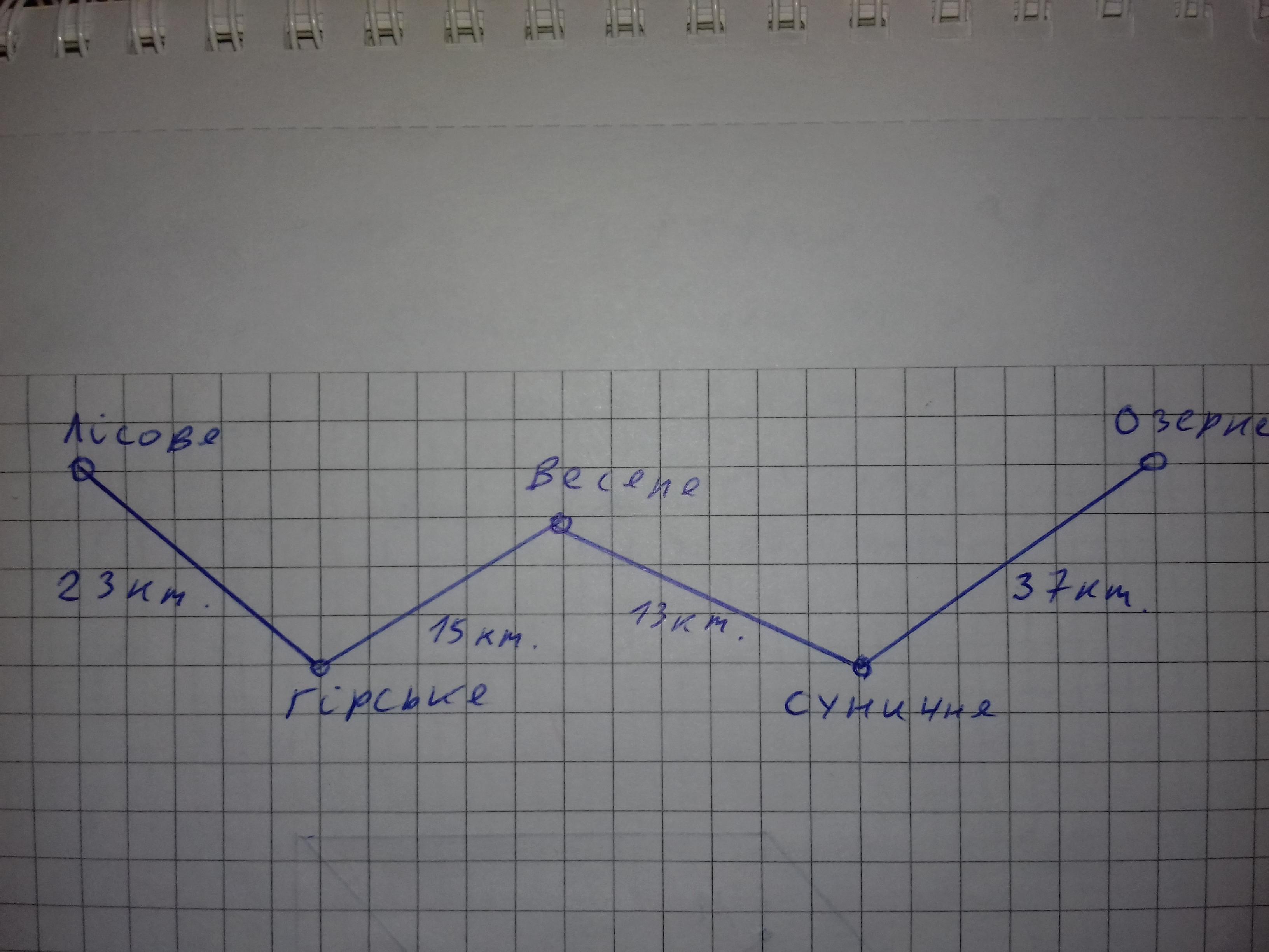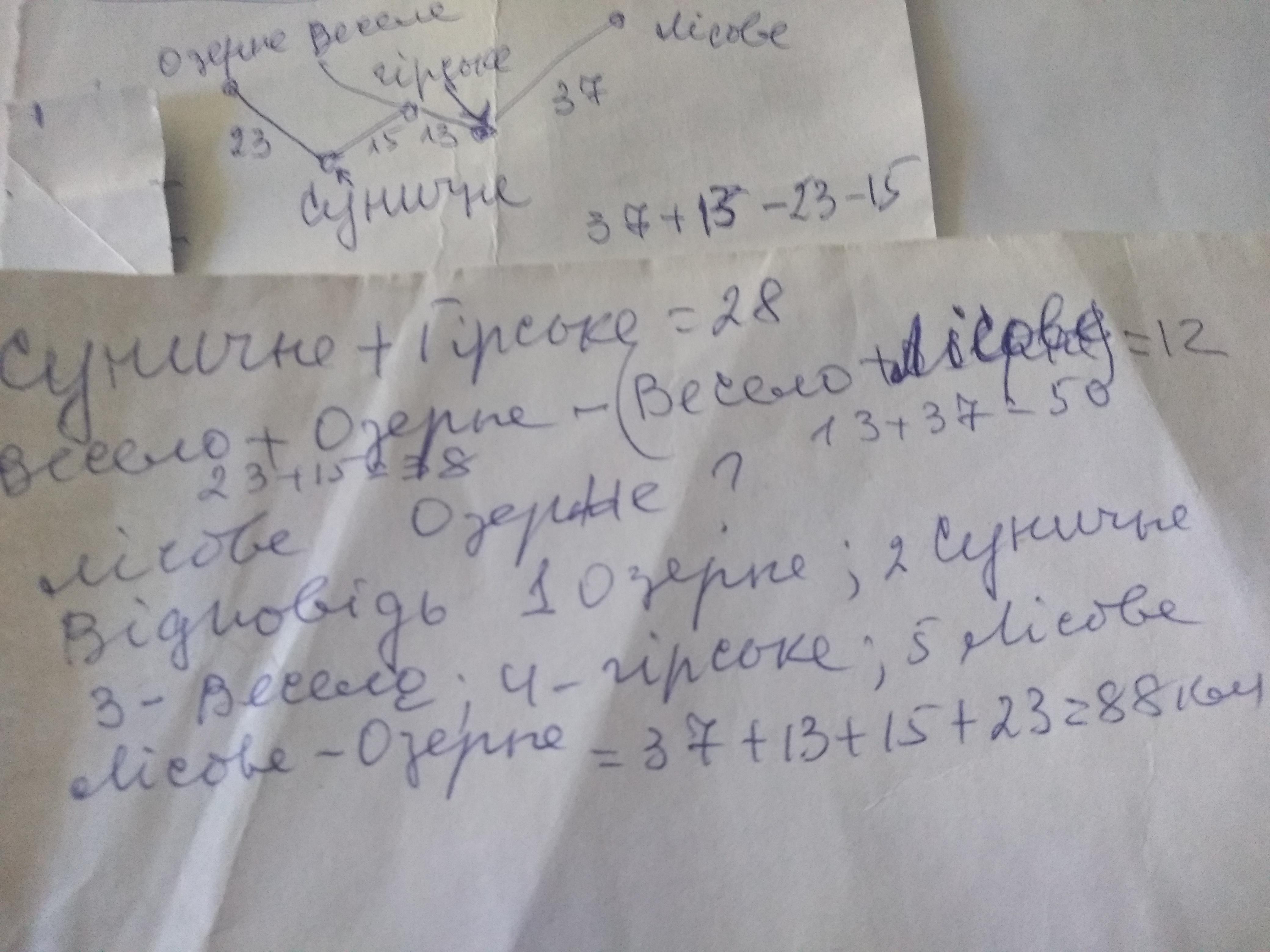 2) Довжина шляху Веселе - Озерне на 12 км більша за довжину шляху Веселе - Лісове. Такі відстані можна знайти на схемі, якщо попарно просумувати відстані 23 км і 15 км та 13 км і 37 км.