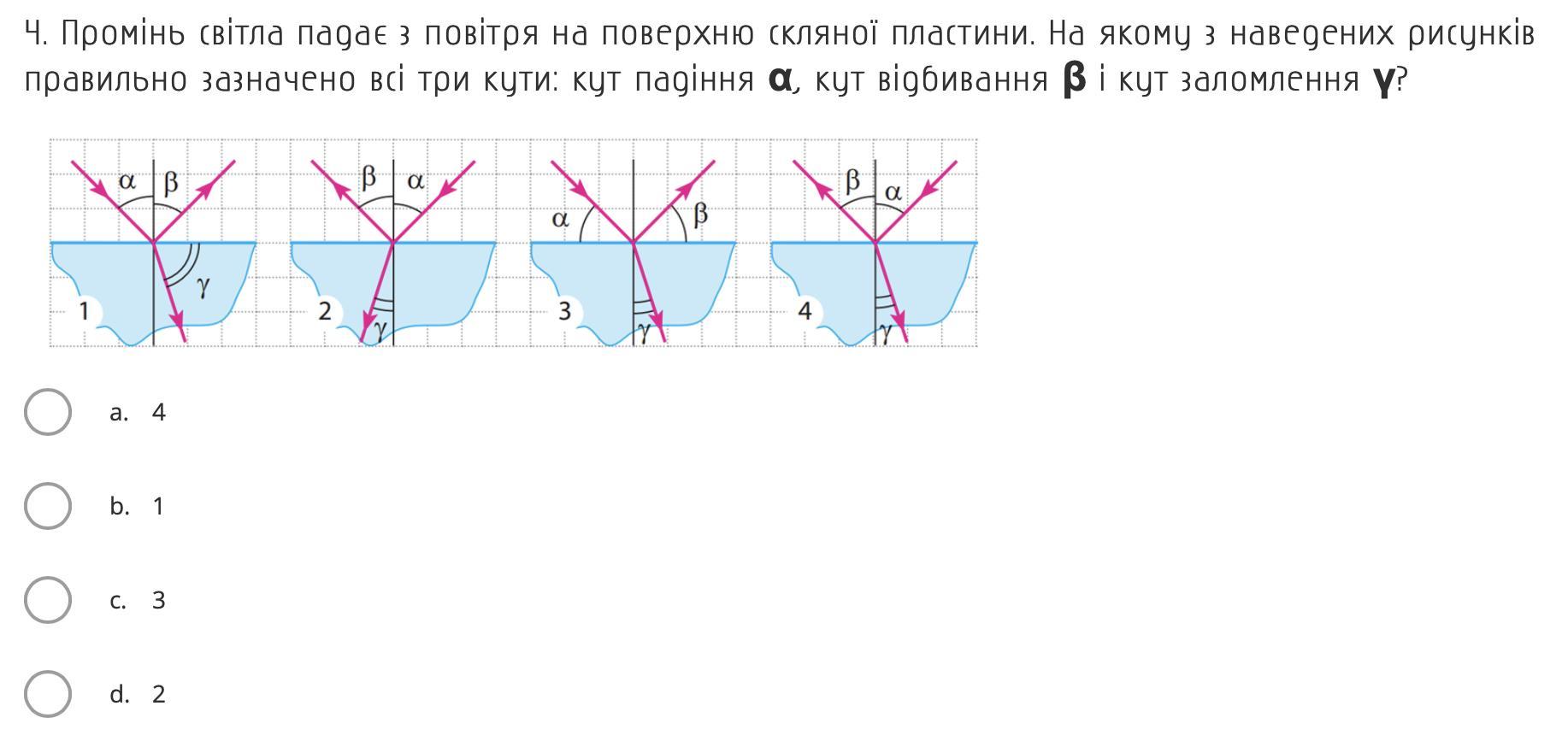 Промінь світла падає з повітря на поверхню скляної пластини. На якому з наведених рисунків правильно зазначено всі три кути: кут падіння α, кут відбивання β і кут заломлення γ?