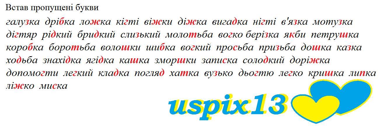 ПРАВОПИС СЛІВ ІЗ ДЗВІНКИМИ ТА ГЛУХИМИ ПРИГОЛОСНИМИ Встав пропущені букви: галу...ка (3, c) дрі...ка (б, п) ло...ка (ж, ш) кі...ті (г, x) ві...ки (ж, ш) ді...ка (ж, ш) вига...ка (д, т) ні...ті (г, x) в'я...ка (3, с) моту...ка (з, с) ді... тяр (г, х) рi...кий (д, т) бри...кий (д, т) сли...ький (3, с) моло...ьба (д, т) во...ко (x, г) бері...ка (3, с) я...би (к, г) петру...ка (ж, ш) коро...ка (б, п) боро...ьба (т, д) воло...ки (ш, ж) ши...ка (б, п) во...кий (г, х) про...ьба (3, с) при...ьба (3, с) до...ка (ж, ш) ка...ка (3, с) хо...ьба (д, т) знахі...ка (д, т) ягі...ка (д, т) ка...ка (ш, ж) змор...ки (ж, ш) запи...ка (3, с) соло...кий (д, т) дорі...ка (ж, ш) допомо...ти (г, x) ле...кий (г, х) кла...ка (д, т) погля... (д, т) ха...ка (д, т) ву...ько (з, с) дьо...тю (x, г) ле... ко (г, х) кри...ка (ш, ж) ли...ка (б, п) лі...ко (ж, ш) ми...ка (3, с) ПОЖАЛУЙСТА УМОЛЯЮ ПОМОГИТЕ