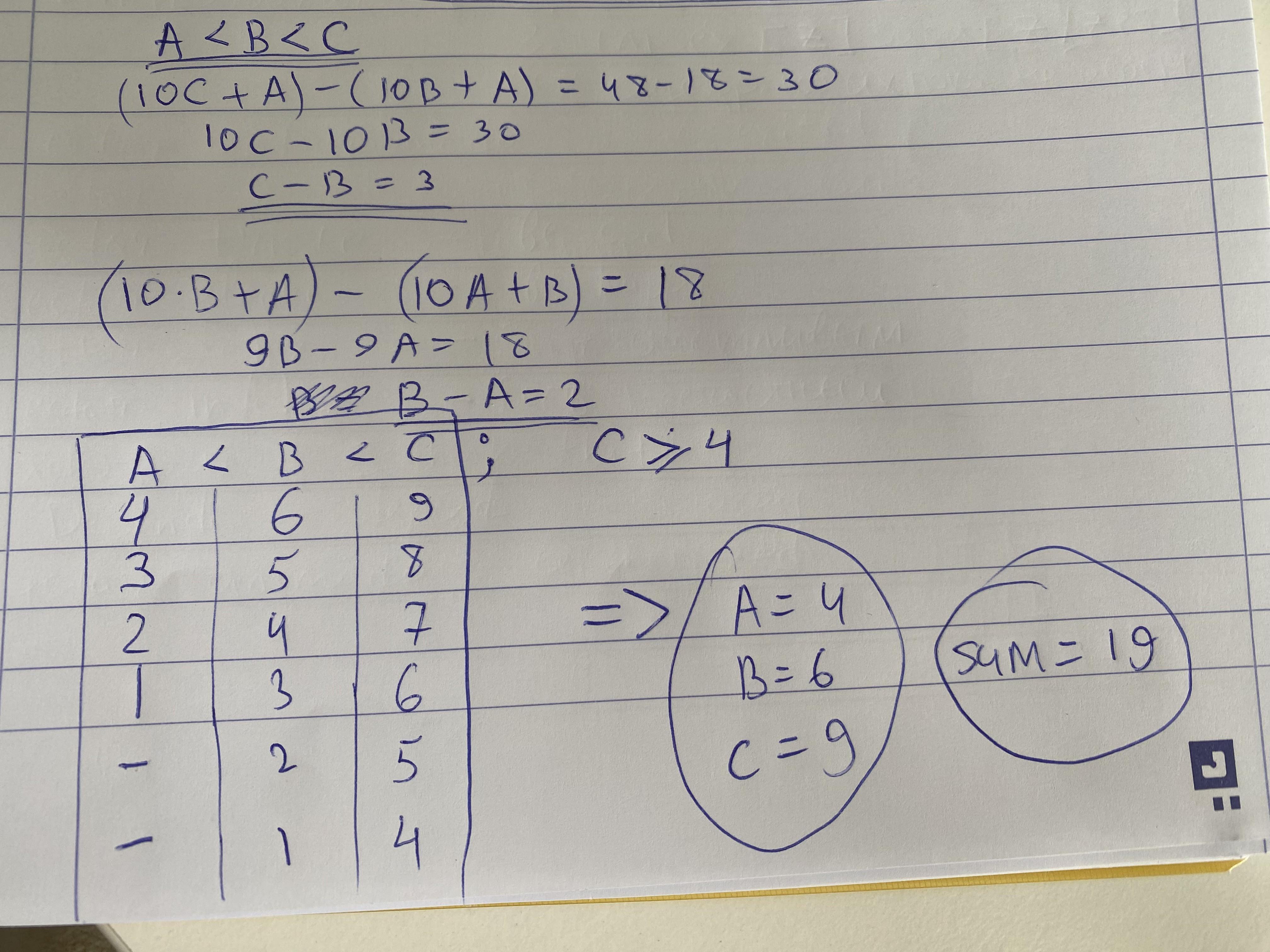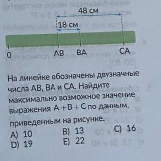 На линейке обозначены двузначные числа АВ, ВА и СА. Найдите максимально возможное значение выражения А+В+С по данным
