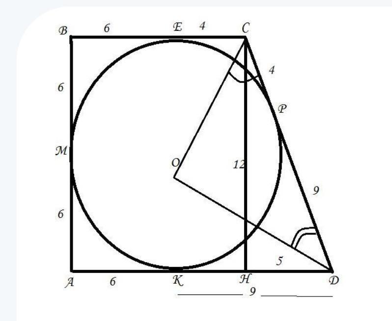 Окружность с центром O, вписанная в прямоугольную трапецию ABCD, делит его большую сторону CD в точке касания E на части длиной 4 и 9 от вершины C. Верны ли следующие утверждения?