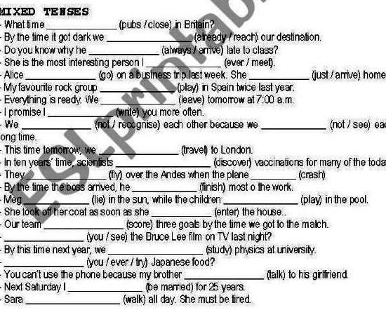 MIXED TENSES - What time_ - By the time it got dark we - Do you know why he - She is the most interesting person I. - Alice (pubs/close) in Britain? - My favourite rock group. - Everything is ready. We - I promise I - We .(go) on a business trip last week. She. (already/reach) our destination. (always / arrive) late to class? (ever / meet). long time. - This time tomorrow, we - In ten years' time, scientists - They - By the time the boss arrived, he - Meg (play) in Spain twice last year. (leave) tomorrow at 7:00 a.m. (write) you more often. .(not/ recognise) each other because we (travel) to London. (ly) over the Andes when the plane (discover) vaccinations for many (crash) (play) in th (finish) most o the work. (just/a (lie) in the sun, while the children. (ne
