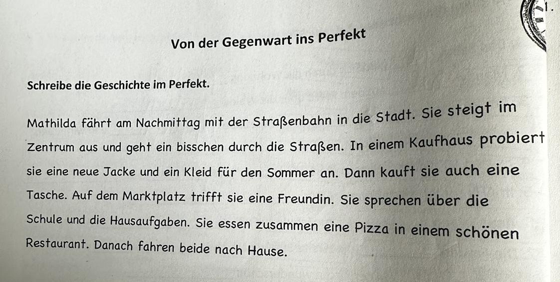 Matilda ist am Nachmittag mit der Strassenbahn in die Stadt gefahren. Sie ist im Zentrum ausgestiegen und ist ein bisschen durch die Strasse gegangen. In einem Kaufhaus hat sie eine neue Jacke und ein Kleid für den Sommer anprobiert. Dann hat sie auch eine Tasche gekauft. Auf dem Marktplatz hat sie eine Freundin getroffen. Sie haben über die Schule und die Hausaufgaben gesprochen. Sie haben zusammen eine Pizza in einem schönen Restaurant gegessen. Danach sind beide nach Hause gefahren.