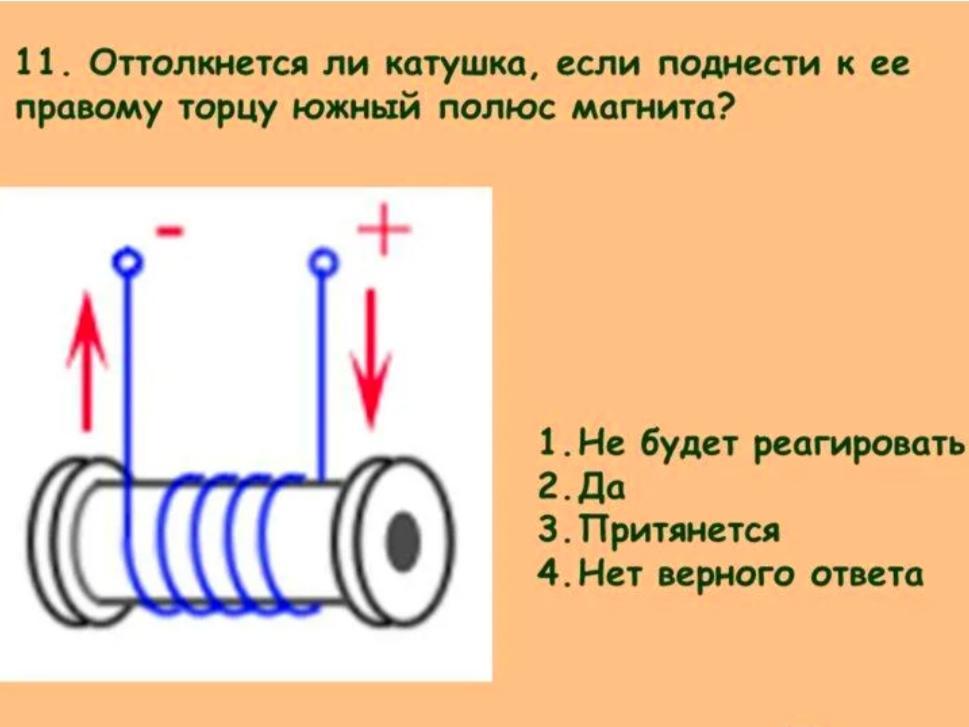 Чи відштовхнеться котушка, якщо піднести до її правого кінця південний полюс магніту? Відповідь поясніть.