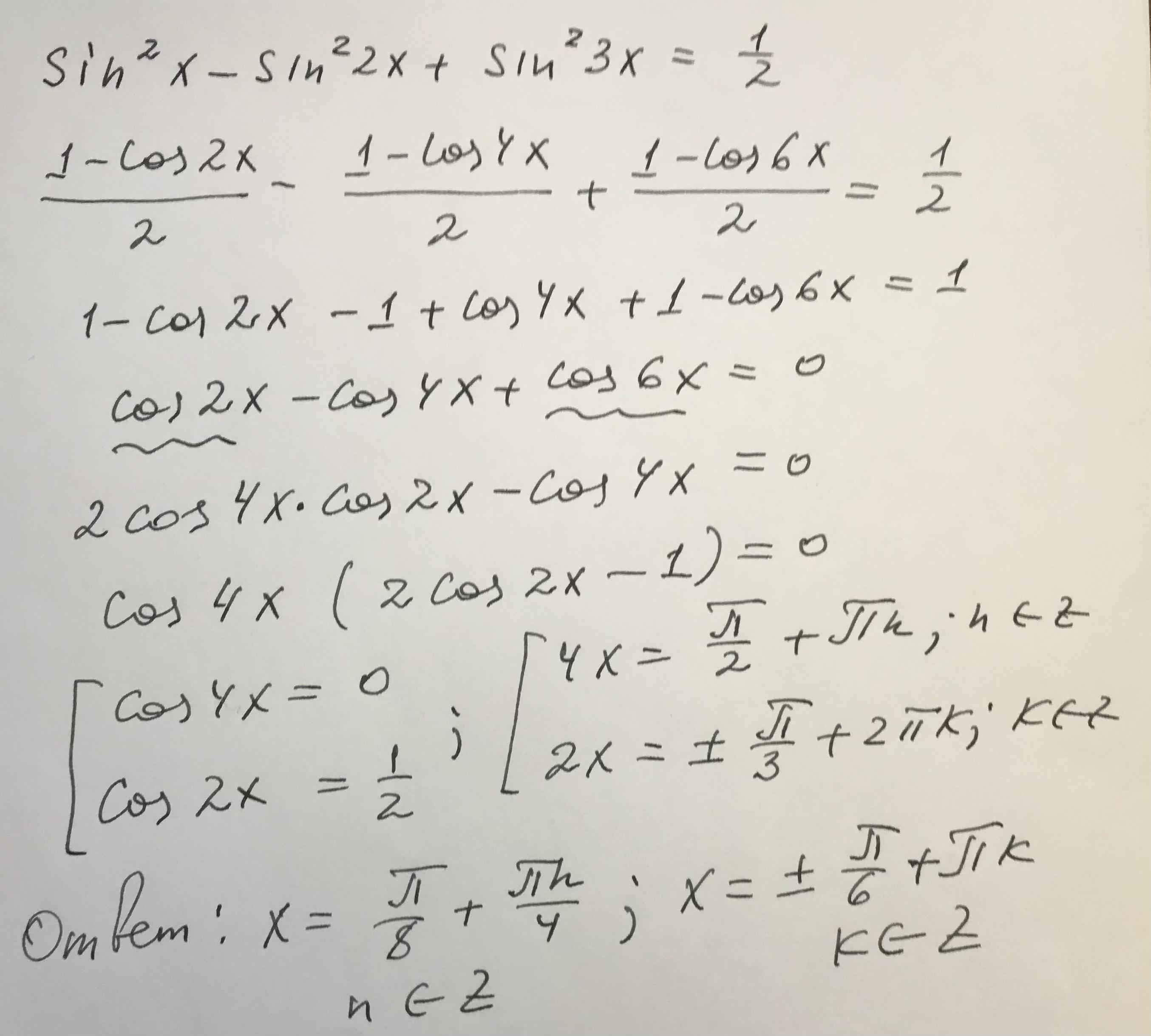 Как решить уравнение: (sinx)^2–(sin2x)^2+(sin3x)^2=1/2