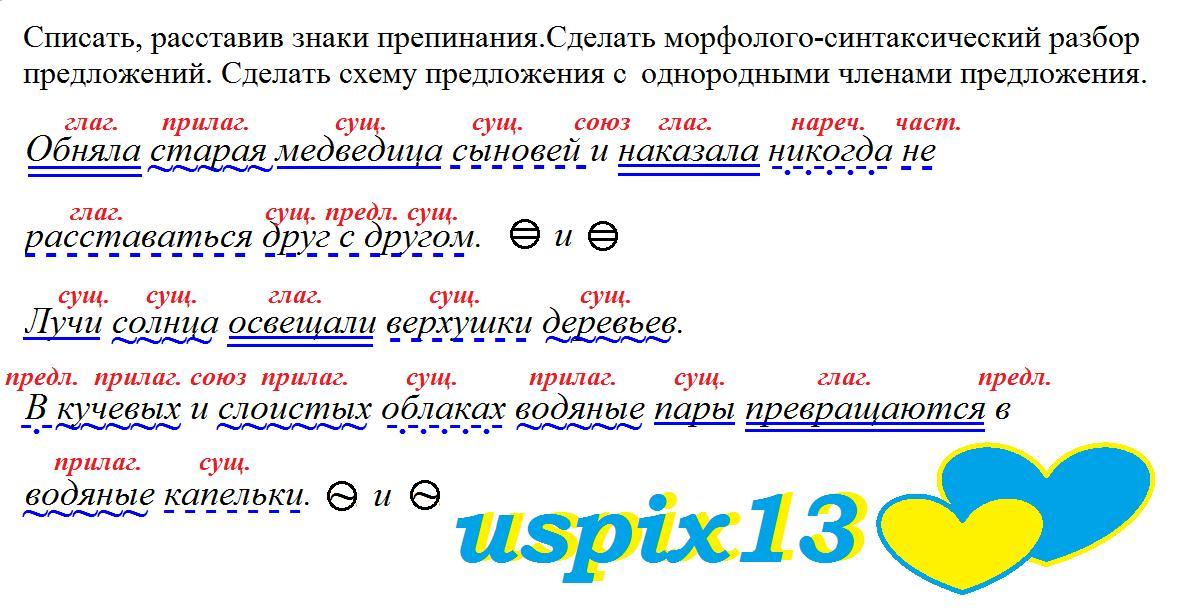 №1. Списать. Сделать морфолого- синтаксический разбор предложений. - Обняла старая медведица сыновей и наказала никогда не расставаться друг с другом. с Лучи солнца освещали верхушки деревьев. В кучевых и слоистых облаках водяные пары превращаются в водяные капельки. Сделать схему предложений с однородными членами предложения.