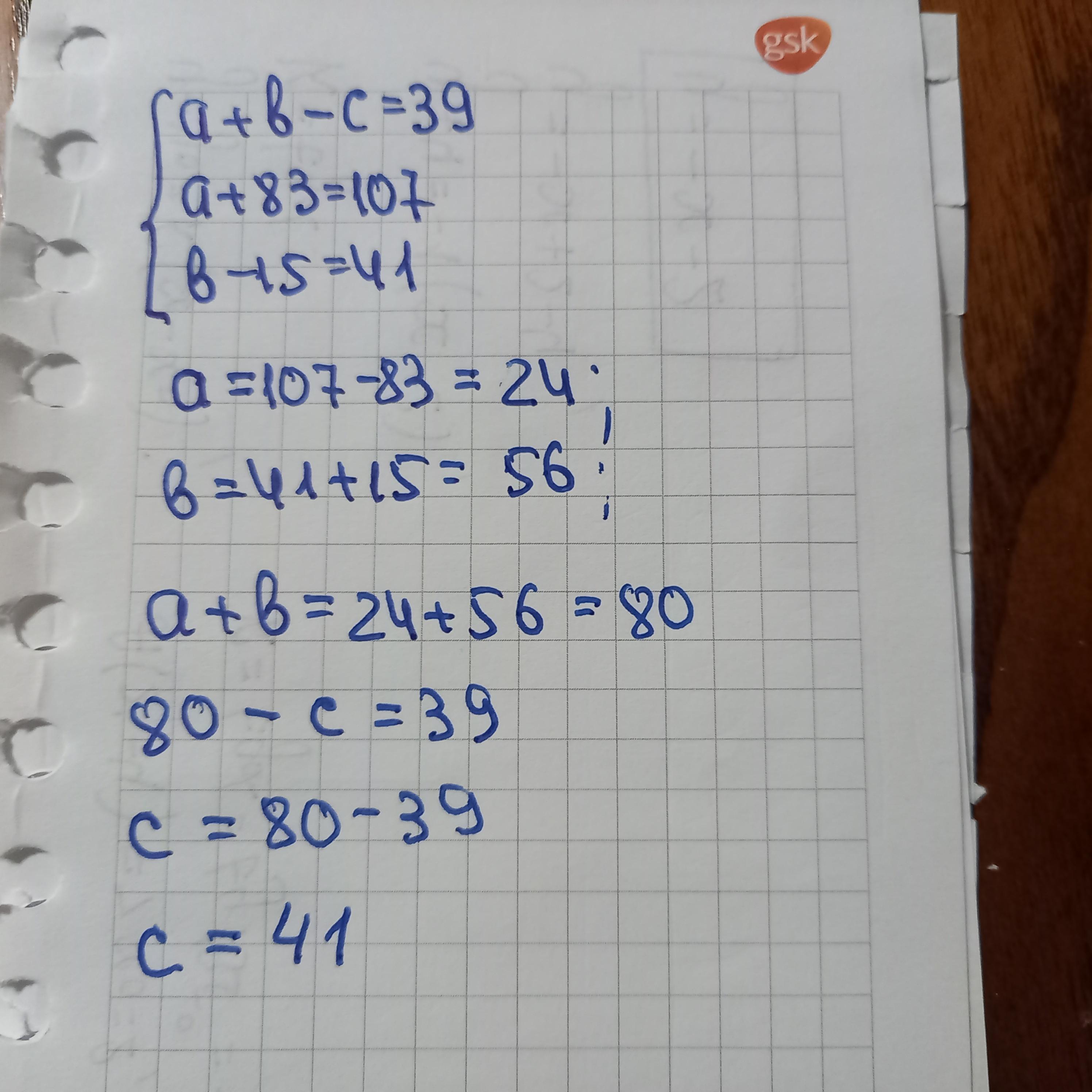 Чему равно c если a+b-c=39, a+83=107, b-15=41??