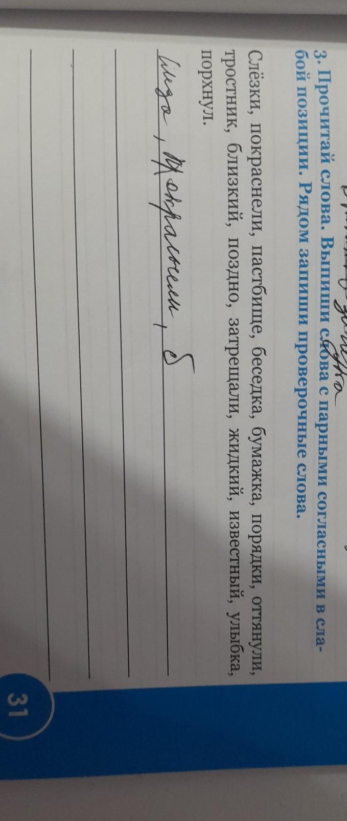 3. Прочитай слова. Выпиши слова с парными согласными в сла- бой позиции. Рядом запиши проверочные слова. Слёзки, покраснели, пастбище, беседка, бумажка, порядки, оттянули, тростник, близкий, поздно, затрещали, жидкий, известный, улыбка, порхнул.