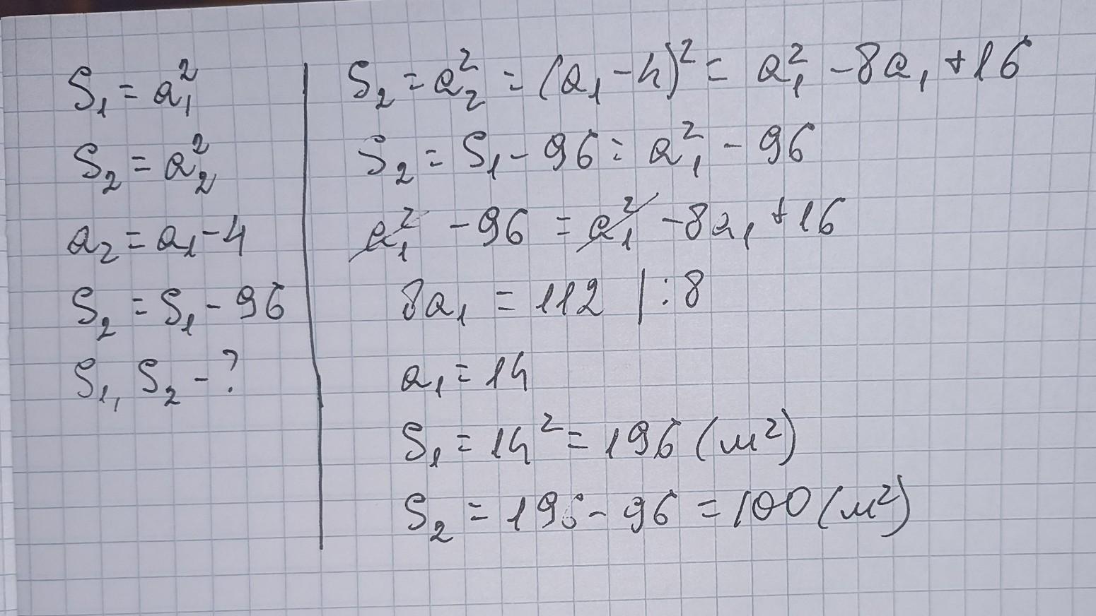 Если сторону квадрата уменьшить на 4м, то получится квадрат, площадь которого меньше площади первоначального квадрата на 96м2. найдите площадь квадрата.