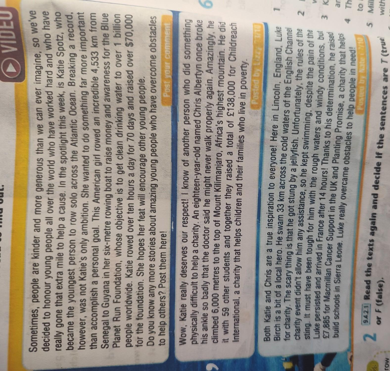 2 9.4.2.1 Read the texts again and decide if the sentences are T (tr or F (false). 1 Katie's only goal was to raise money for charity. 2 Katie wanted to bring the work of Blue Planet to people's attention. Chris broke his ankle while climbing Mount Kilimanjaro. 3 4 Chris raised money to help people walk again. 5 Luke received medical treatment after being stung by a jellyfish. 6 Luke raised money for two causes. ДАЮ 100 БАЛЛОВ