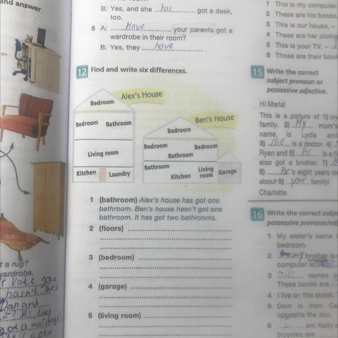 3. Alex's house has got 2 bedrooms. Ben's house hasn't got 2 bedrooms. It has got 3 bedrooms.