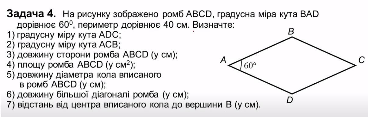 7) центр вписанной в ромб окружности совпадает с точкой пересечения диагоналей, а точка пересечения диагоналей делит их пополам. значит, расстояние от этой точки до вершины В равно 0.5 • BD = 0.5 • 10 см = 5 см