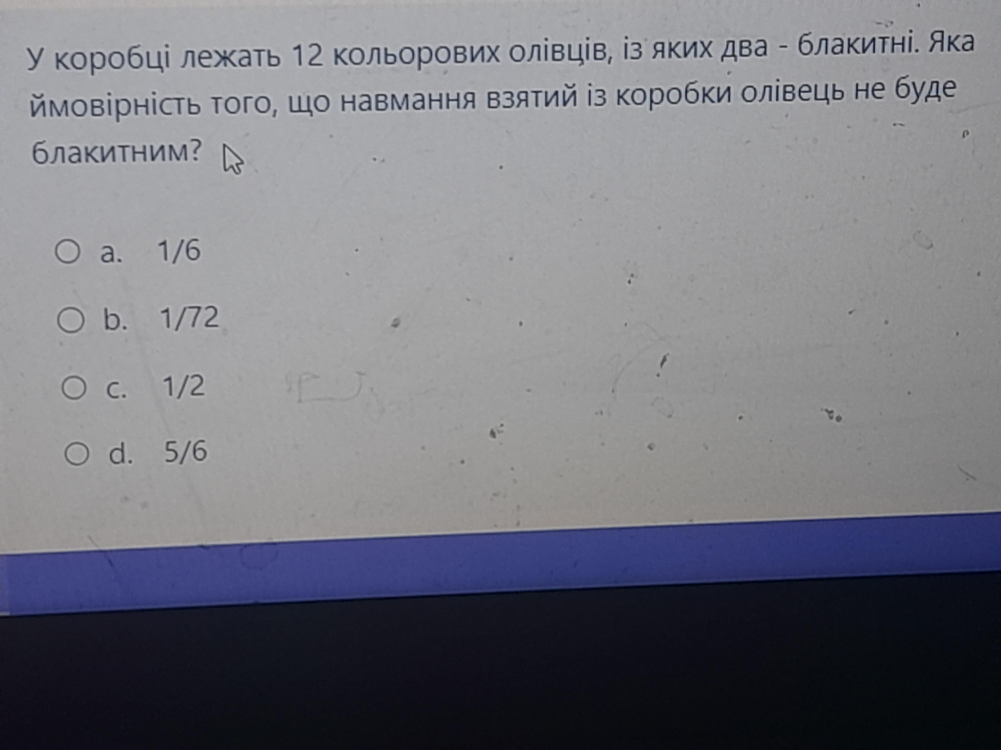 Объяснение: Всього у нас 12 олівців. Блакитних лише 2. Тобто, кожен 6 олівець буде блакитним. Вірогідність дістати блакитний олівець 1 до 6.