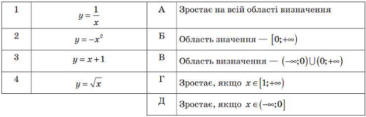7. Установіть відповідність між функцією (1–4) і властивістю (А–Д), яку має ця функція.