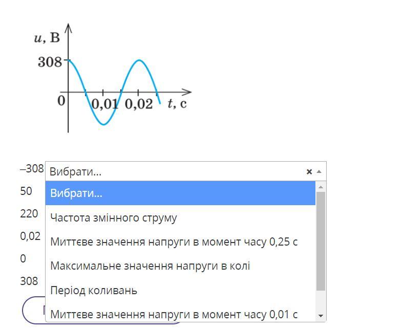 За графіком залежності напруги в колі змінного струму від часу (див. рисунок) установіть відповідність між фізичною величиною та її числовим значенням у