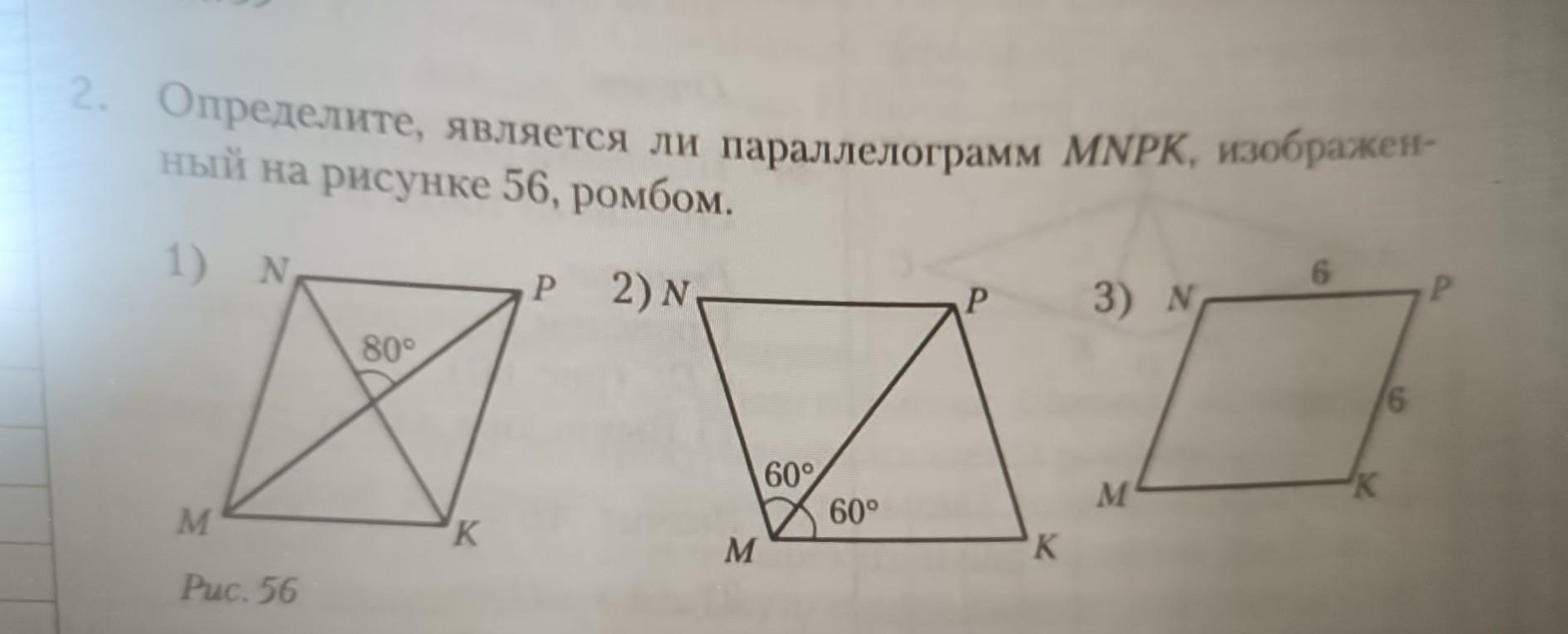 Срочно!!! Помогите пожалуйста. Определите, является ли параллелограмм MNPK, изображённый на рисунке 56, ромбом.