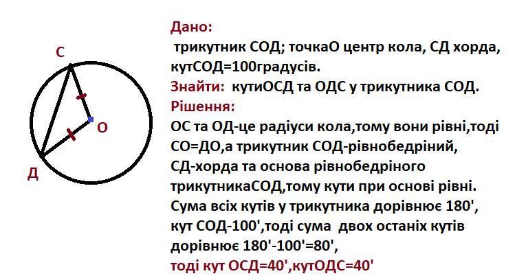 трикутник СОД; точкаО центр кола, СД хорда, кутСОД=100градусів.