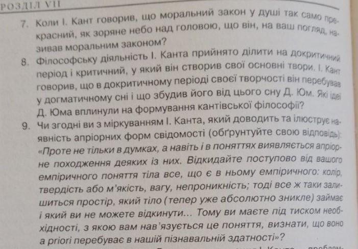 7. Коли I. Кант говорив, що моральний закон у душi так само пре красний, як зоряне небо над головою, що він, на ваш погляд, на. зивав моральним законом? 8. філософську діяльність 1. Канта прийнято ділити на докритичний період і критичний, у який він створив свої основні твори. I. Какт говорив, що в докритичному періоді своєї творчості він перебував у догматичному сні і що збудив його від цього сну Д. Юм. Які іде Д. Юма вплинули на формування кантівської філософії? 9. Чи згодні ви з міркуванням I. Канта, який доводить та ілюструє на явність апріорних форм свідомості (обгрунтуйте свою відповідь):