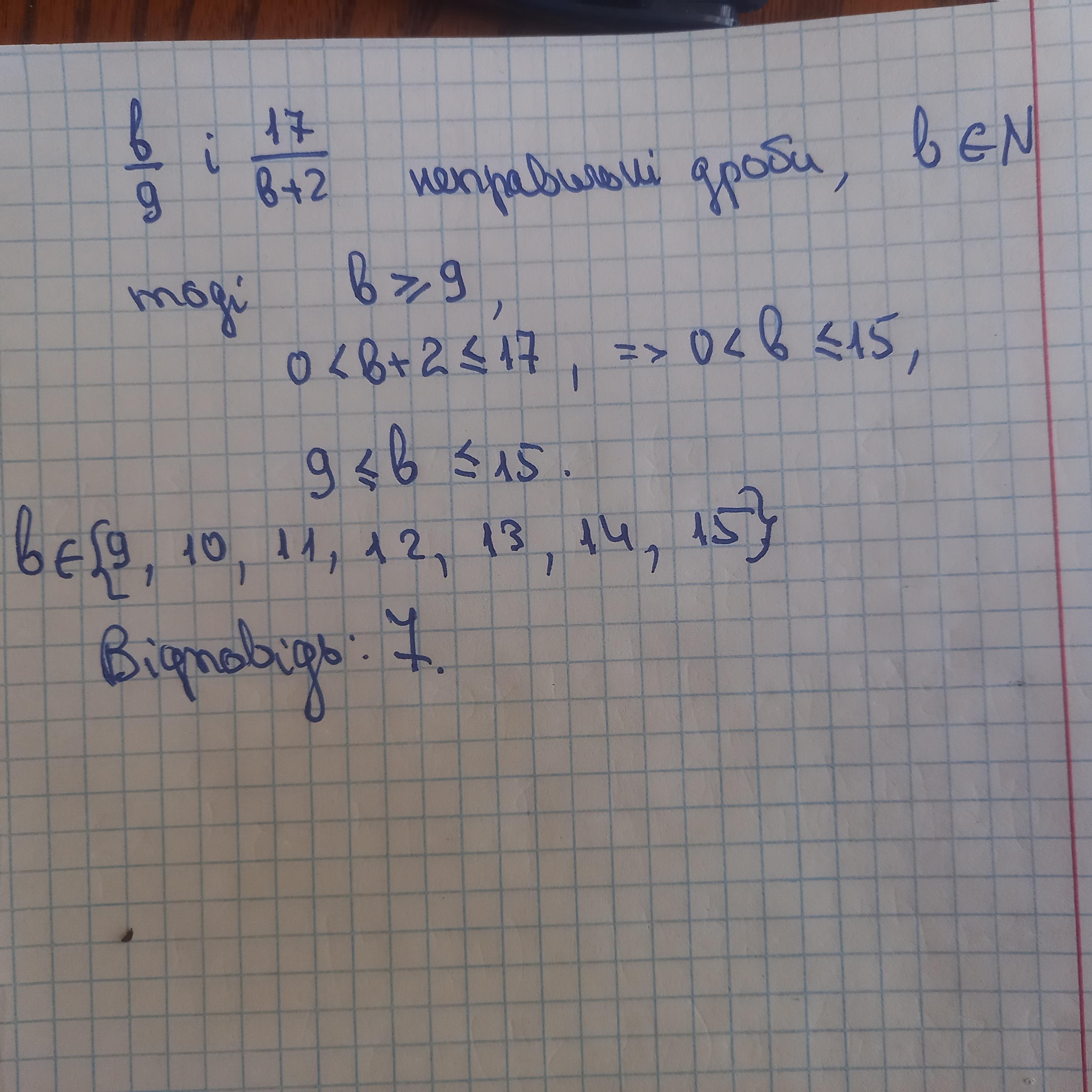 скільки існує натуральних чисел b таких, щоб обидва дроби b/9 і 17/b+2 одночасно були неправильним