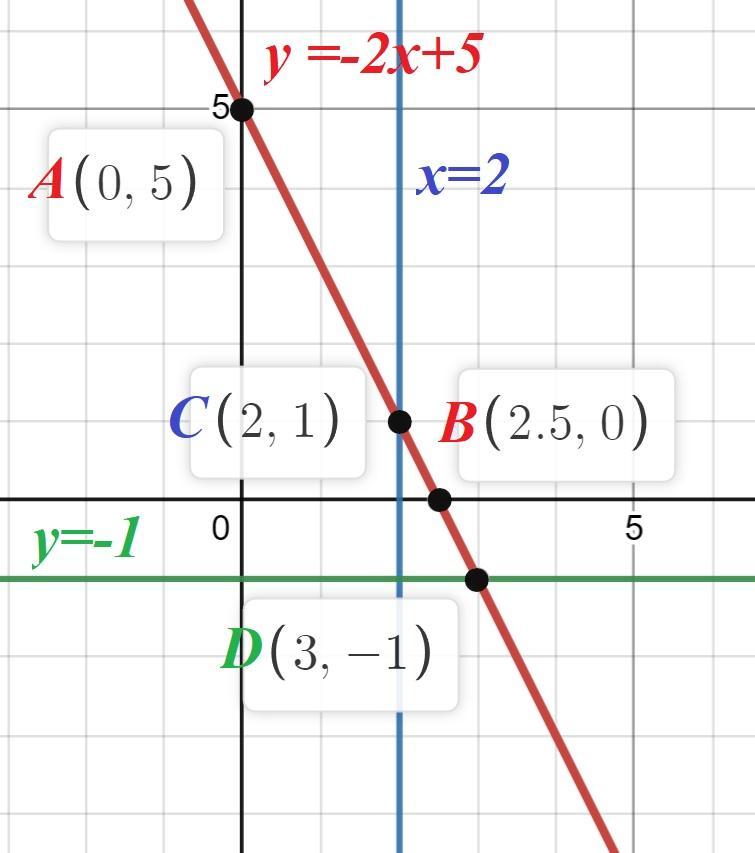 При y=0 x=2.5 => Точка B. (См. скриншот)