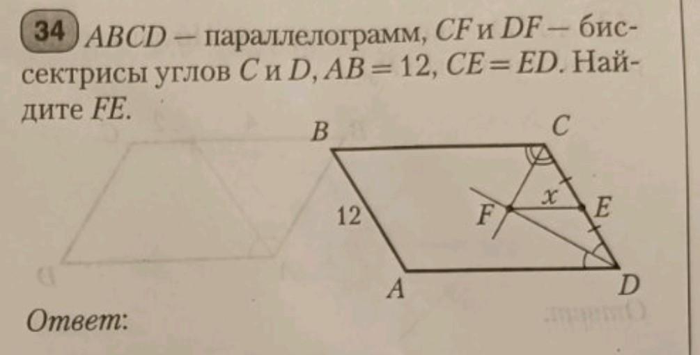 ∠С+∠D=180°(сумма углов параллелограмма прилежащих к одной стороне). ∠CFE=180°-(∠C+∠D)/2=90°